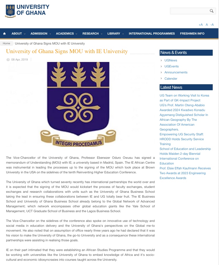 El documento que hoy publica LD explica que "el Vicerrector de la Universidad de Ghana, Profesor Ebenezer Oduro Owusu, ha firmado un memorando de entendimiento (MOU) con IE; una universidad con sede en Madrid, España. El Africa Center del lE contribuyó decisivamente a liderar los procesos hasta la firma del MOU que tuvo lugar en la Universidad de Brown, en paralelo a la décima Conferencia Reinventing Higher Education".