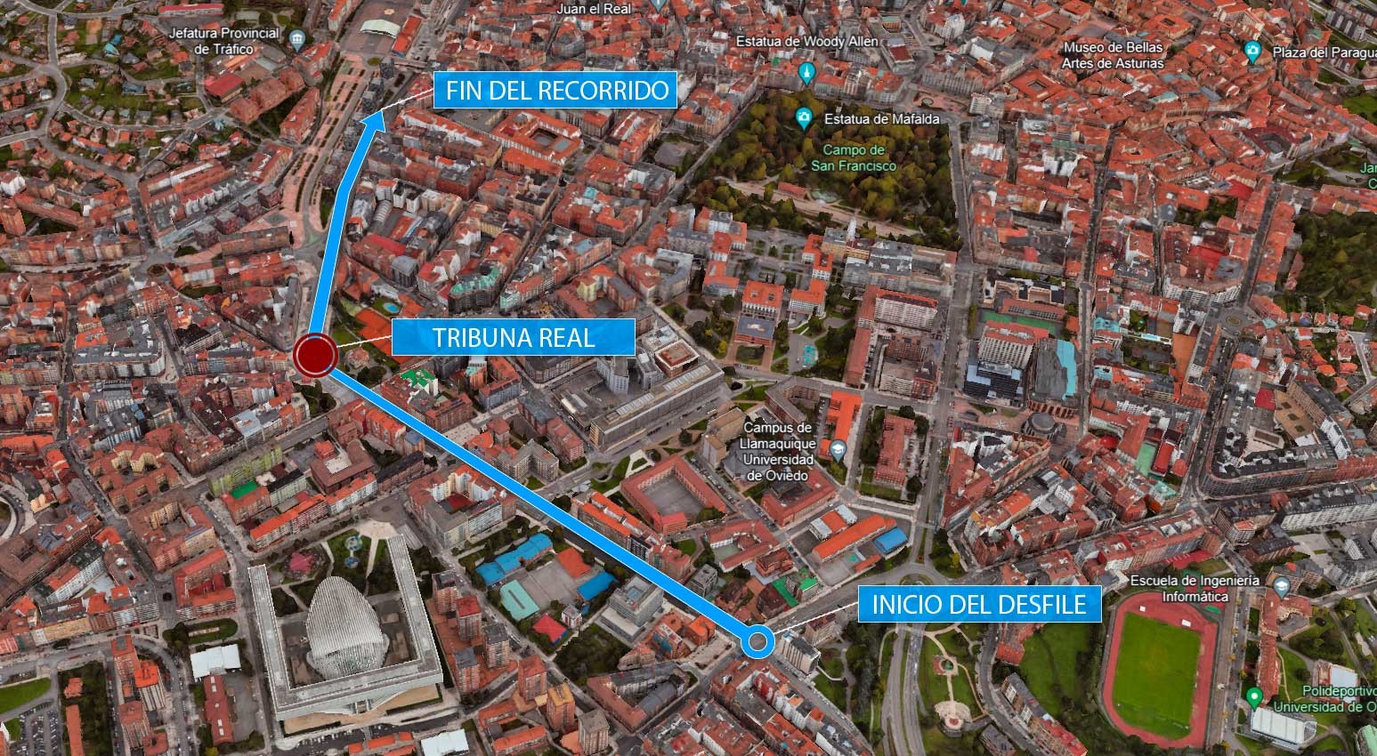 El acto central, con el tradicional desfile militar, tendrá lugar en Oviedo el sábado 25 de mayo y estará presidido por los Reyes de España. Se iniciará en el cruce de la avenida Padre Vinjoy con la avenida Hermanos Menéndez Pidal y la calle Ángel Muñiz Toca, continuará por la avenida Hermanos Menéndez Pidal, calle Real Oviedo y calle de la Independencia hasta el cruce con la avenida de Santander. Un recorrido con una extensión aproximada de un kilómetro.