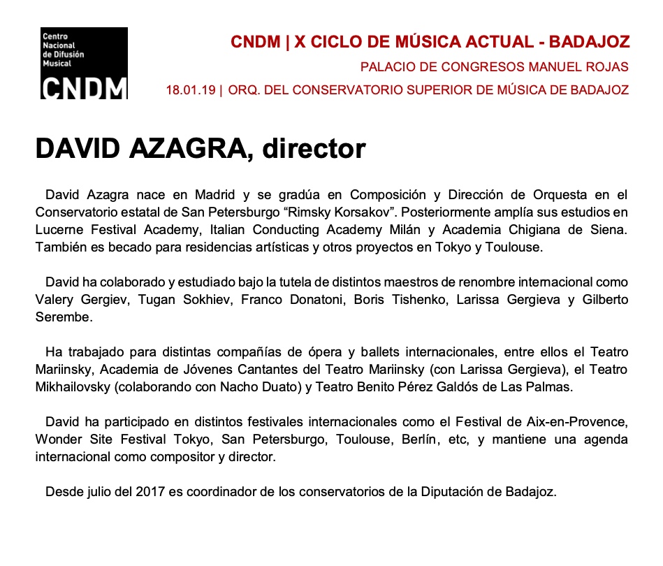 El CV expuesto oficialmente así lo detallaba. "David Azagra nace en Madrid y se gradúa en Composición y Dirección de Orquesta en el Conservatorio estatal de San Petersburgo "Rimsky Korsakov". Posteriormente amplía sus estudios en Lucerne Festival Academy, Italian Conducting Academy Milán y Academia Chigiana de Siena. También es becado para residencias artísticas y otros proyectos en Tokyo y Toulouse". Todo un anticipo. "David ha colaborado y estudiado bajo la tutela de distintos maestros de renombre internacional como Valery Gergiev, Tugan Sokhiev, Franco Donatoni, Boris Tishenko, Larissa Gergieva y Gilberto Serembe. Ha trabajado para distintas compañías de ópera y ballets internacionales, entre ellos el Teatro Mariinsky, Academia de Jóvenes Cantantes del Teatro Mariinsky (con Larissa Gergieva), el Teatro Mikhailovsky (colaborando con Nacho Duato) y Teatro Benito Pérez Galdós de Las Palmas", añadía el cartel oficial. "David ha participado en distintos festivales internacionales como el Festival de Aix-en-Provence, Wonder Site Festival Tokyo, San Petersburgo, Toulouse, Berlín, etc, y mantiene una agenda internacional como compositor y director". Y, añadía, "desde julio del 2017 es coordinador de los conservatorios de la Diputación de Badajoz".