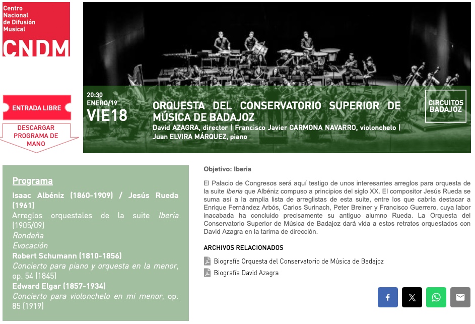 "El Palacio de Congresos será aquí testigo de unos interesantes arreglos para orquesta de la suite Iberia que Albéniz compuso a principios del siglo XX. El compositor Jesús Rueda se suma así a la amplia lista de arreglistas de esta suite, entre los que cabría destacar a Enrique Fernández Arbós, Carlos Surinach, Peter Breiner y Francisco Guerrero, cuya labor inacabada ha concluido precisamente su antiguo alumno Rueda", rezaba la publicidad oficial. "La Orquesta del Conservatorio Superior de Música de Badajoz dará vida a estos retratos orquestados con David Azagra en la tarima de dirección", terminaba el anuncio.