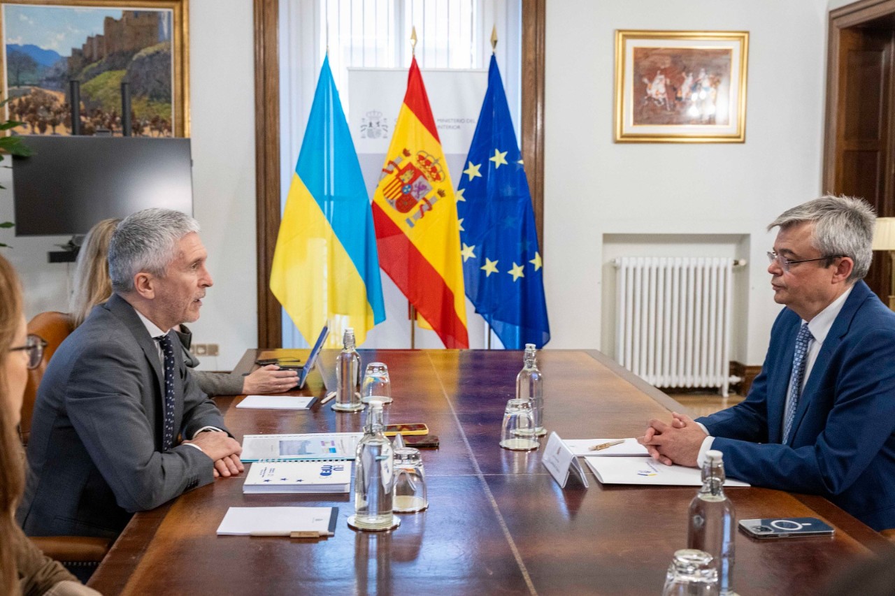 El Ministerio del Interior ha albergado este lunes un encuentro entre el titular español de la cartera, Fernando Grande Marlaska, y el embajador de Ucrania en Madrid, Serhii Pohoreltsev. Una cita que ha servido para continuar el ambiente de buenas relaciones que existe entre ambos países, sobre todo después de que los países de la Unión Europea y la OTAN se hayan volcado en apoyar al Gobierno de Kiev tras la invasión rusa de Ucrania.