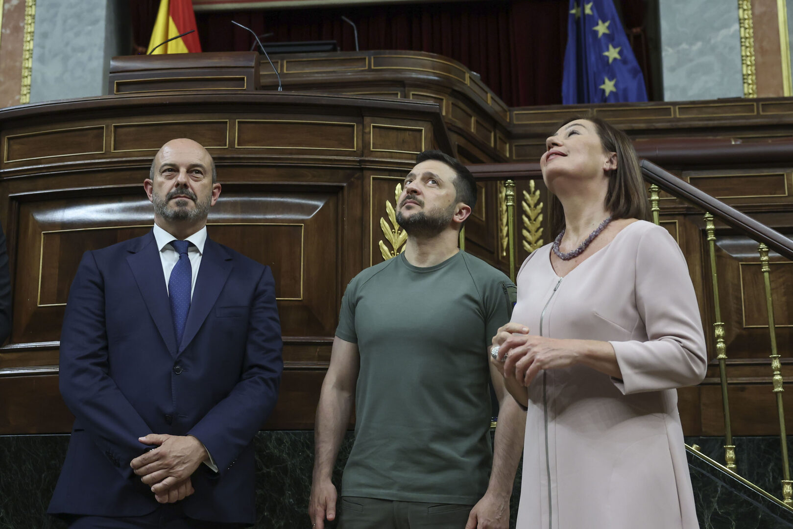 A las cinco y cuarto, Zelenski ha sido recibido por la presidenta del Congreso, Francina Armengol, y por el presidente del Senado, Pedro Rollán, para posteriormente dirigirse al Salón de Pasos Perdidos para firmar en el Libro de Honor. "La memoria de que el pueblo de España está codo a codo con nosotros en estos momentos tormentosos se grabará en la conciencia de las generaciones de ucranianos de hoy y mañana", ha dejado escrito Zelenski.