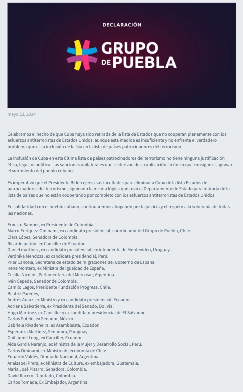 "Es imperativo que el Presidente Biden ejerza sus facultades para eliminar a Cuba de la lista Estados de patrocinadores del terrorismo, siguiendo la misma lógica que tuvo el Departamento de Estado para retirarla de la lista de países que no están cooperando por completo con los esfuerzos antiterroristas de Estados Unidos", añade el documento del Grupo de Puebla, una organización en la que tienen una presencia continua José Luis Rodríguez Zapatero o Adriana Lastra (incluidos en el cuadro de fundadores por la propia organización, junto con Irene Montero, Evo Morales, Rafael Correa o el hermano de Delcy Rodríguez, por poner algunos ejemplos).