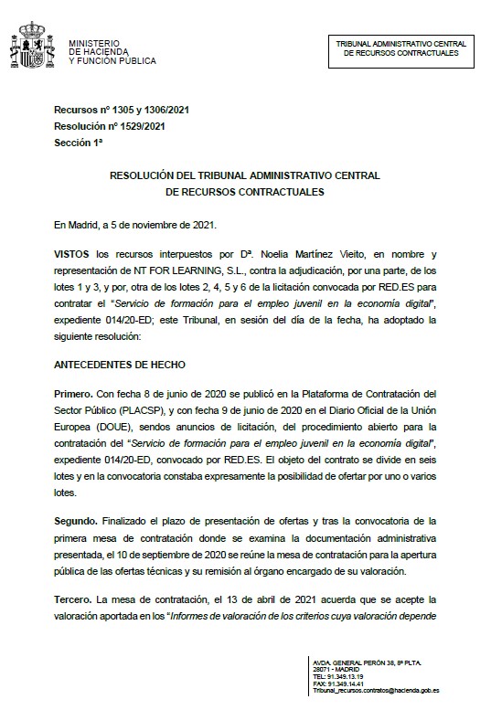Libertad Digital ha tenido acceso a una resolución del Tribunal Administrativo Central de Recursos Contractuales, con fecha 5 de noviembre de 2021, que desestima el recurso presentado por la sociedad NT FOR LEARNING, S.L. contra las adjudicaciones de Red.es a la empresa del amigo de Begoña Gómez. La empresa recurrente afirmaba que la adjudicataria INNOVA NEXT, S.L.U. no cuenta con Plan de Igualdad registrado, no cumpliendo por lo tanto con el requisito exigido en el momento de licitar.