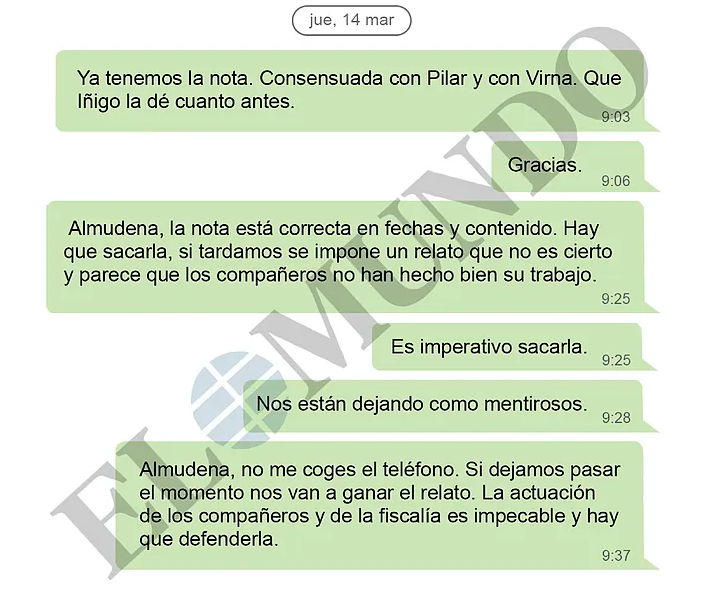 "La actuación de los compañeros y de la fiscalía es impecable y hay que defenderla", insiste el fiscal para considerar que resulta "imperativo" sacar la nota cuanto antes porque si no, advierte, "nos van a ganar el relato", "nos están dejando como mentirosos", le dice muy ansioso a Almudena Lastra, a la que recrimina que no le coge el teléfono.