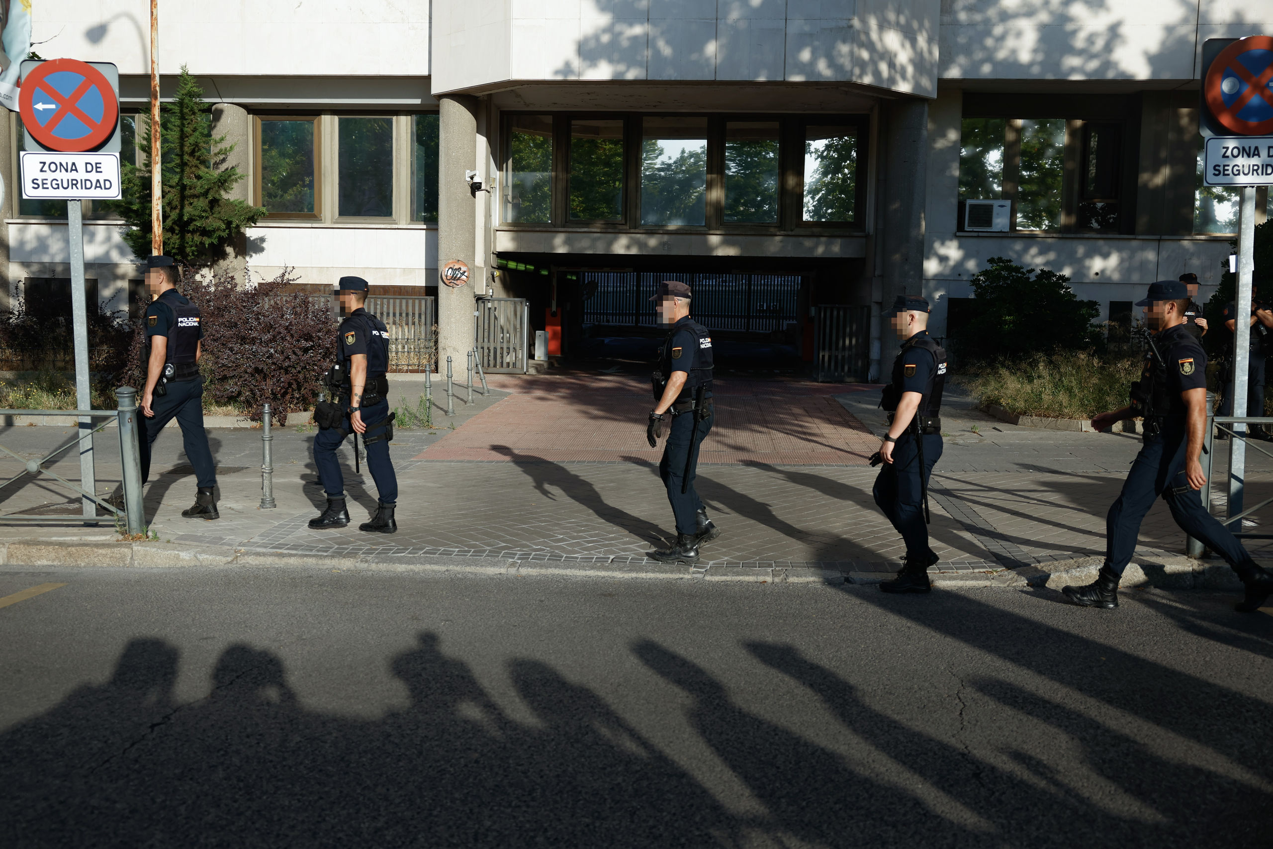 Agentes de Policía vigilan los accesos al juzgado de Plaza de Castilla ante la llegada de la mujer del presidente del Gobierno para prestar declaración como imputada.