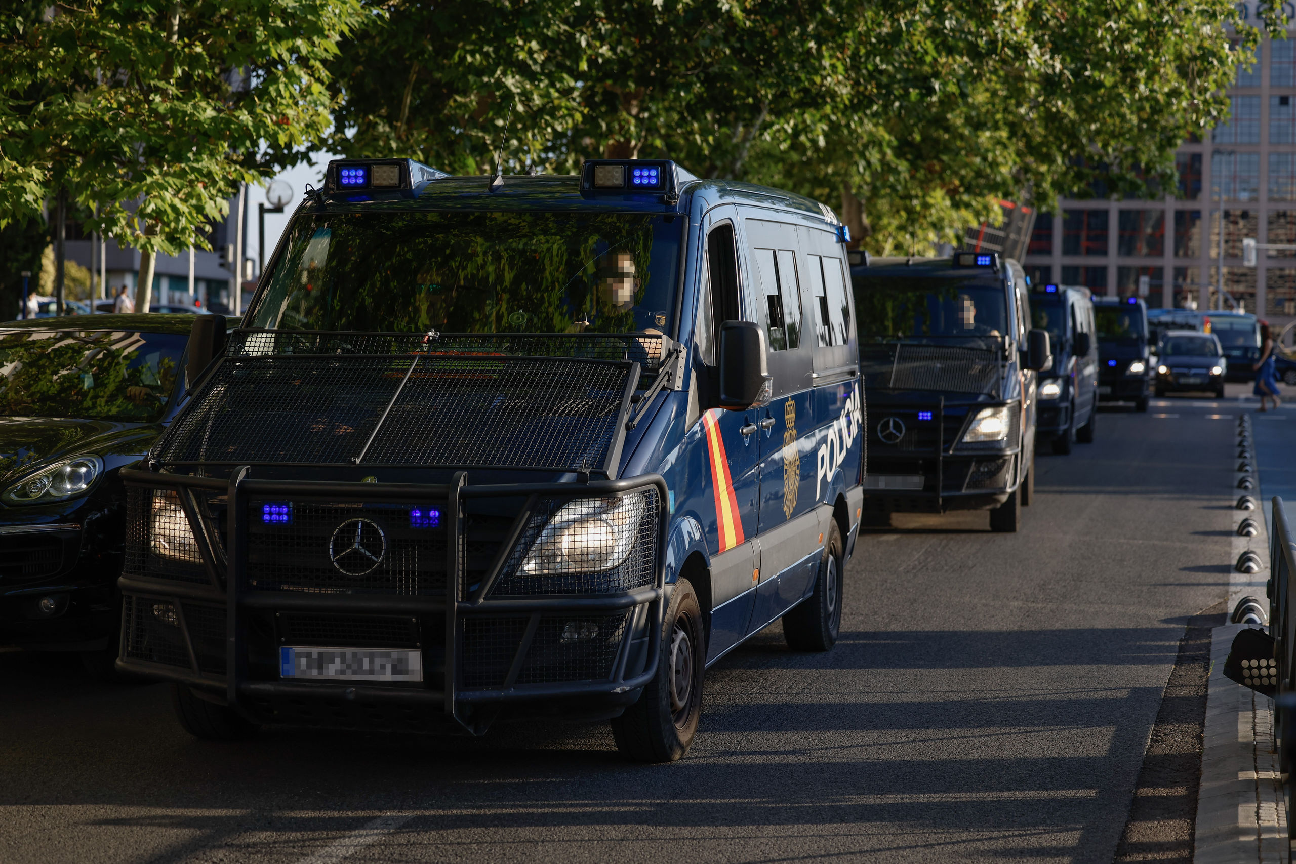Furgones policiales blindan los juzgados de Plaza de Castilla ante la llegada de Begoña Gómez.