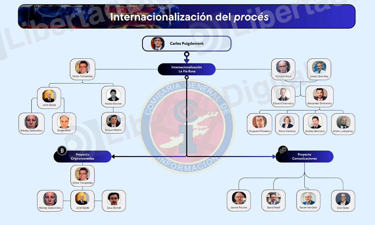 Un informe de 196 páginas de la Comisaría General de Información de la Policía Nacional, al que ha tenido acceso Libertad Digital, refleja "la existencia de una estructura organizacional dirigida a lograr la independencia por la vía unilateral de Cataluña al margen del marco constitucional vigente, contando con el reconocimiento y apoyo de la Federación de Rusia, siguiendo la estela de los procesos coetáneos de anexión y/o independencia de Crimea, Montenegro o Georgia. La estructura formaba parte de la estrategia de internacionalización de un proyecto mucho más amplio, que respondía a la voluntad superior ideada por Convergencia Democrática de Cataluña (CDC) de la mano de Artur Mas, en el que se establecía una «hoja de ruta» dividida en varias fases y vertebrada por una serie de líneas estratégicas interrelacionadas, consideradas necesarias para la creación de un nuevo Estado independiente".