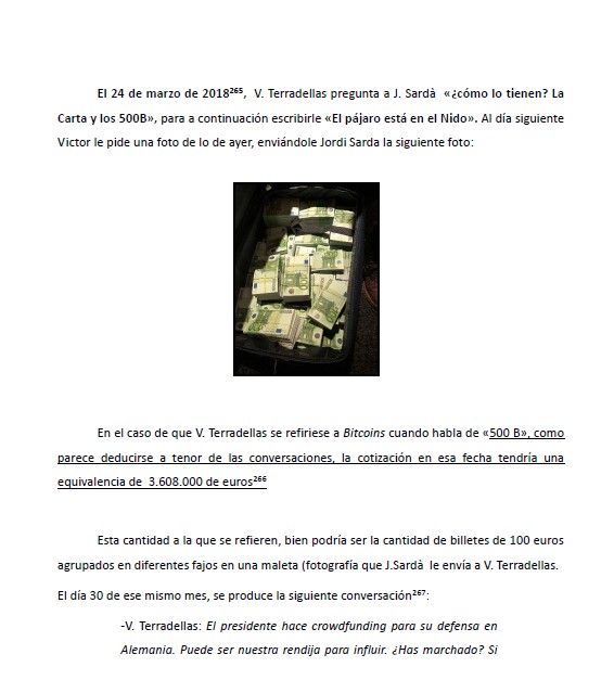 "Esta estrategia nació en una suerte de cumbre ruso catalana presidida por el president de la Generalitat, Carles Puigdemont, la víspera de la DUI, y plasmada en varias evidencias intervenidas a los directores de la estructura en sus diferentes etapas, fructificando en sendos proyectos conjuntos en los que se integraron los investigados y una serie de individuos relacionados con la administración y los servicios de inteligencia de la Federación de Rusia: el proyecto de criptoactivos dirigido a la implantación de un sistema monetario digital basado en la conversión del dinero líquido en Bitcoins para eludir la acción fiscalizadora del Gobierno central; y el proyecto de comunicaciones incardinado en el ámbito cognitivo mediante campañas de desinformación y dirigido a obtener el apoyo de la opinión pública y de las instituciones internacionales", apunta el informe.