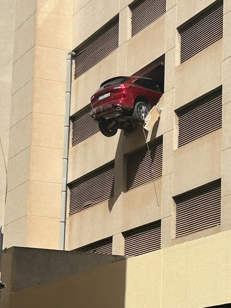 Una conductora de 49 años ha sufrido un ataque de ansiedad este jueves por la mañana tras dar marcha atrás por error, romper el muro y dejar la parte trasera de su coche colgando en el aire desde el tercer piso de un aparcamiento situado en la avenida de Ignasi Wallis de la ciudad de Ibiza.