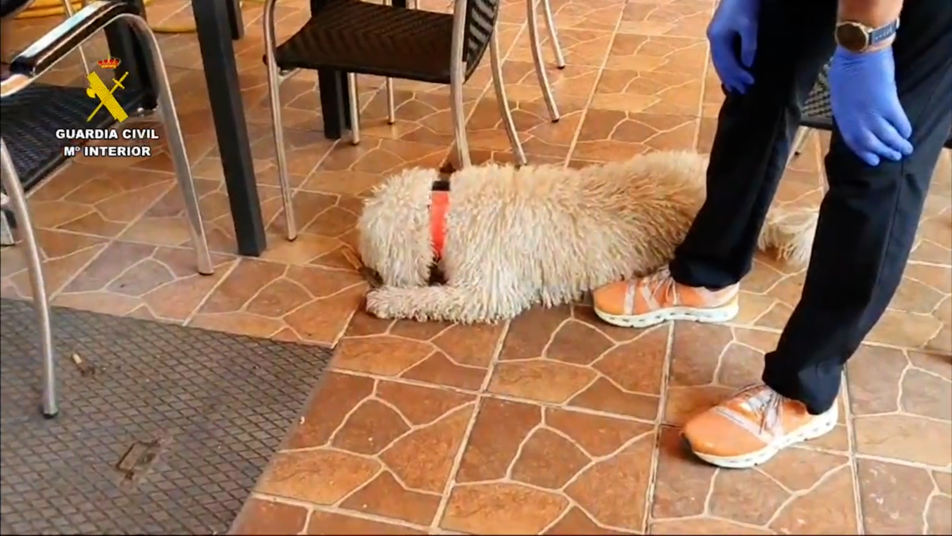 Imágenes del ejercicio realizado por el perro del Servicio Cinológico especializado en búsqueda de restos biológicos donde marca el arma encontrada previamente en la localidad de Mocejón, e imágenes del análisis en laboratorio del arma encontrada esta mañana en el mismo lugar.