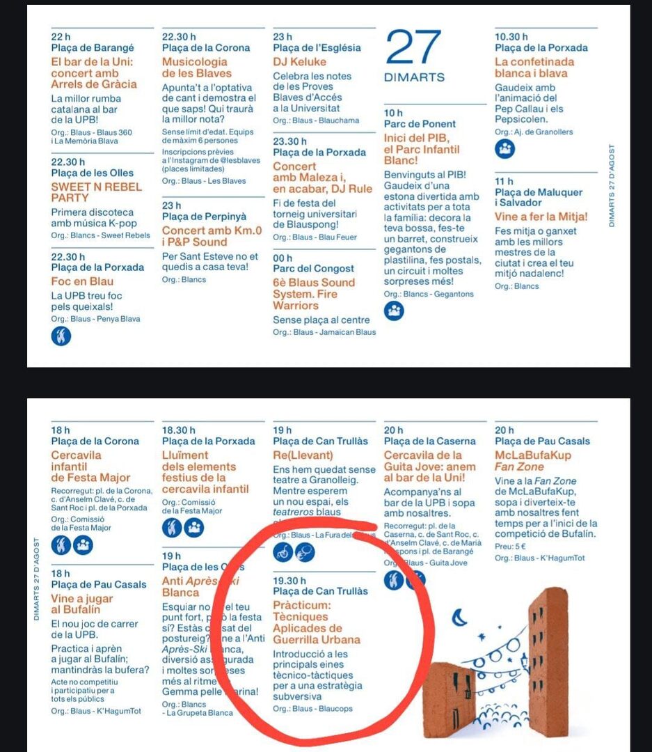 "Las festes populars en Cataluña no defraudan. Después del robo e incendio "festivo" de la bandera de España en Cardedeu, ahora, en la vecina Granollers, organizan para sus fiestas patronales un 'Prácticum de Guerrilla Urbana aplicada'", reza el mensaje de Escolano en el que se adjunta el programa festivo que contiene el taller de lanzamiento de cócteles molotov.