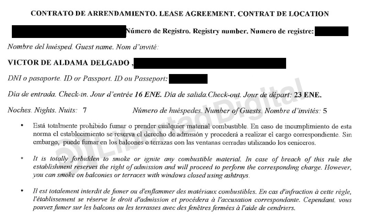 Pues bien, un nuevo elemento informativo se incorpora ahora a estas aportaciones. Se trata del contrato de arrendamiento firmado por los dueños de Velázquez Manor, una casa de absoluto lujo en la zona más exclusiva y discreta de Madrid -El Viso-. El número de registro fue "VT-XXXXX" y el "nombre del huésped: VÍCTOR DE ALDAMA DELGADO, Alfonso XI X, X izda, Madrid. España. DNI o pasaporte. XXXXXXXXJ".