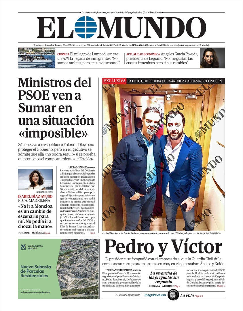 Pedro Sánchez sí conocía a Víctor de Aldama y así lo demuestra la imagen que publica este domingo en portada el diario El Mundo.
