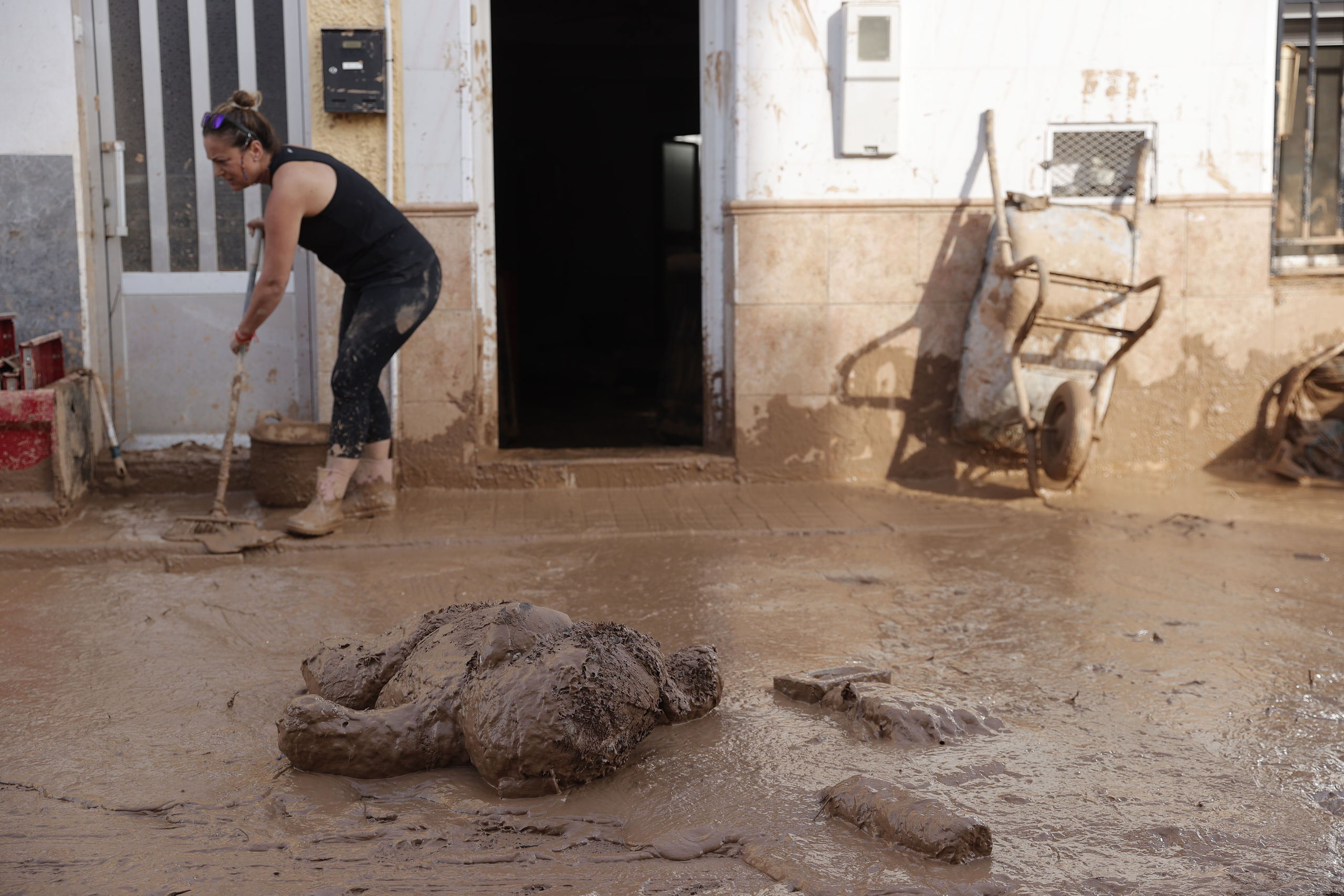 Varias personas retiran el lodo acumulado en una calle de la localidad valenciana de Paiporta.
