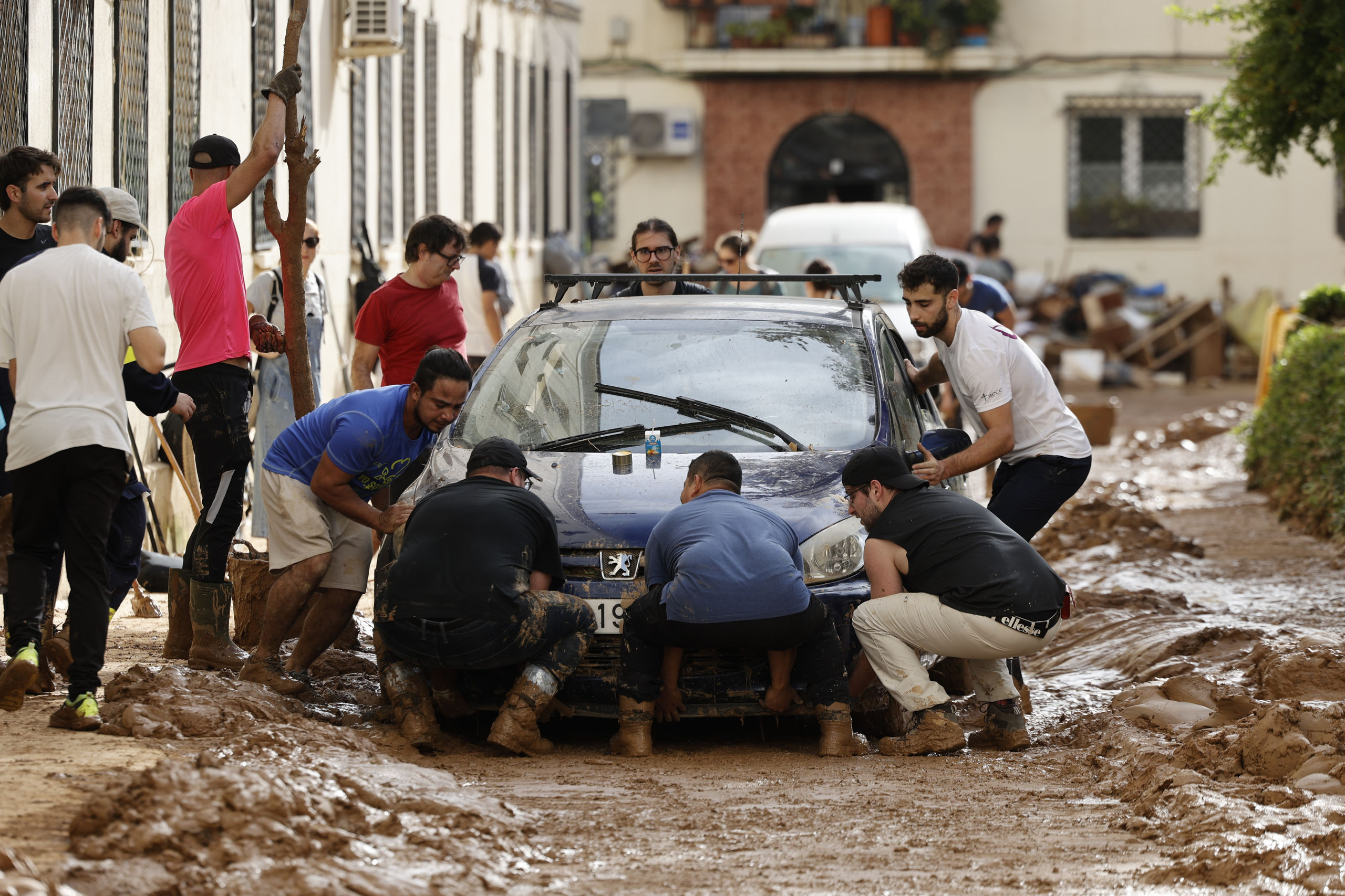 Varias personas rtiran un vehículo atrapado entre el lodo, en el barrio de La Torre, en Valencia, este viernes