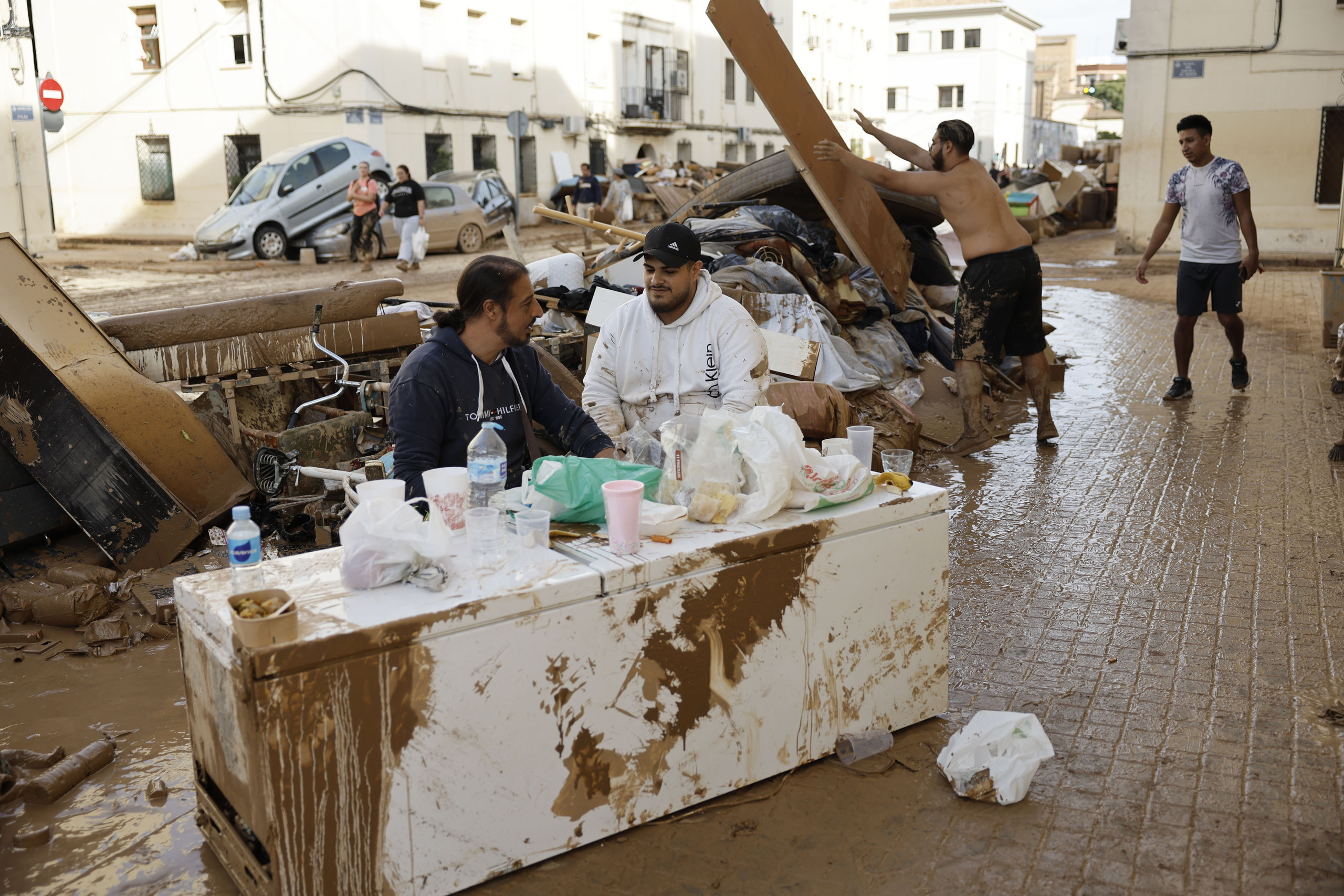 Vecinos del barrio de La Torre utilizan una nevera como mesa en plena calle del devastado barrio valenciano.