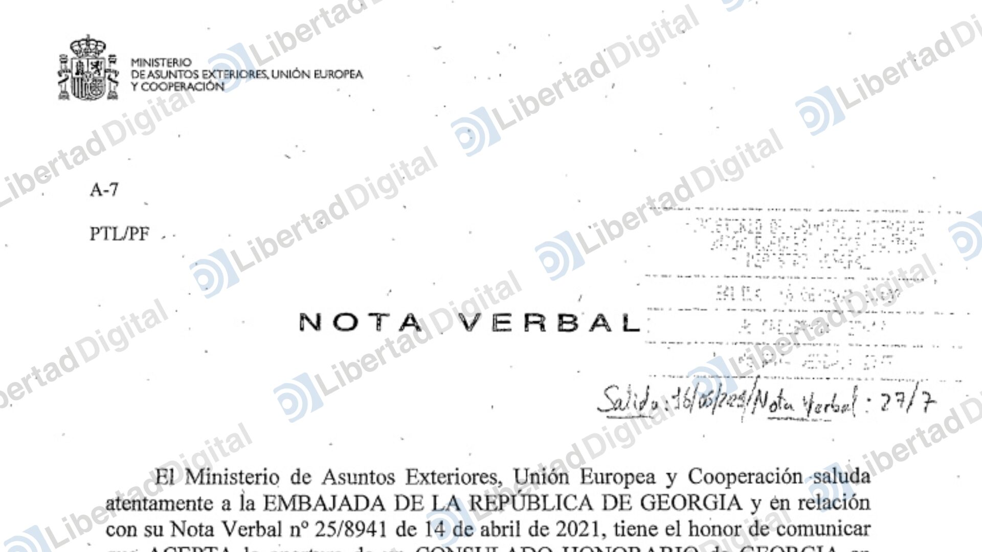 Exteriores especificó más: "Asimismo, solicita sean comunicadas a este Departamento las direcciones física y de correo electrónico, así como el número de teléfono de la autorizada nueva oficina consular de la República de Georgia en Zamora y la remisión a este Departamento de los formularios y fotografías necesarias para poder tramitar la tarjeta de acreditación del Sr. DE ALDAMA DELGADO". Porque el privilegio de cónsul incluye un rango oficial. "El Ministerio de Asuntos Exteriores, Unión Europea y Cooperación aprovecha la oportunidad para reiterar a la Embajada las seguridades de su alta consideración: Madrid, 15 de junio de 2021".