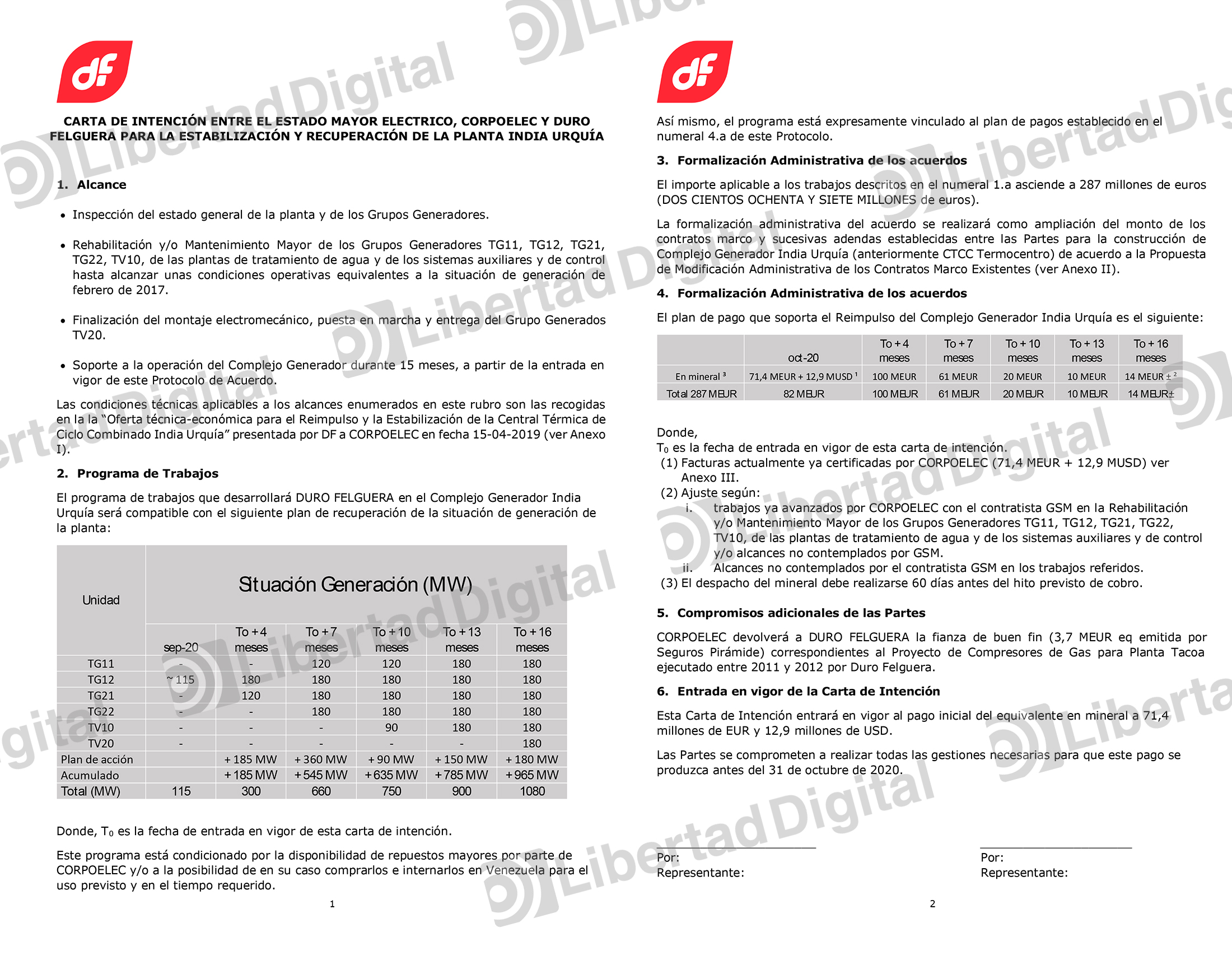 Dicha propuesta cubre un alcance de recuperación de la potencia nominal ya transferida en su día a Corpoelec (900MW) y el cierre del segundo ciclo combinado para adicionar otros 180MW. Estos trabajos conllevarían una inversión de 287 millones de euros para la recuperación y puesta en servicio de un total de 1.080 MW y el medio de pago, mineral de hierro y oro . En caso de concretarse la referida oferta DF se compromete a renunciar a los derechos adquiridos y recogidos en los contratos vigentes relacionados con extra-costes por sobre-permanencia, intereses y escalatorias.