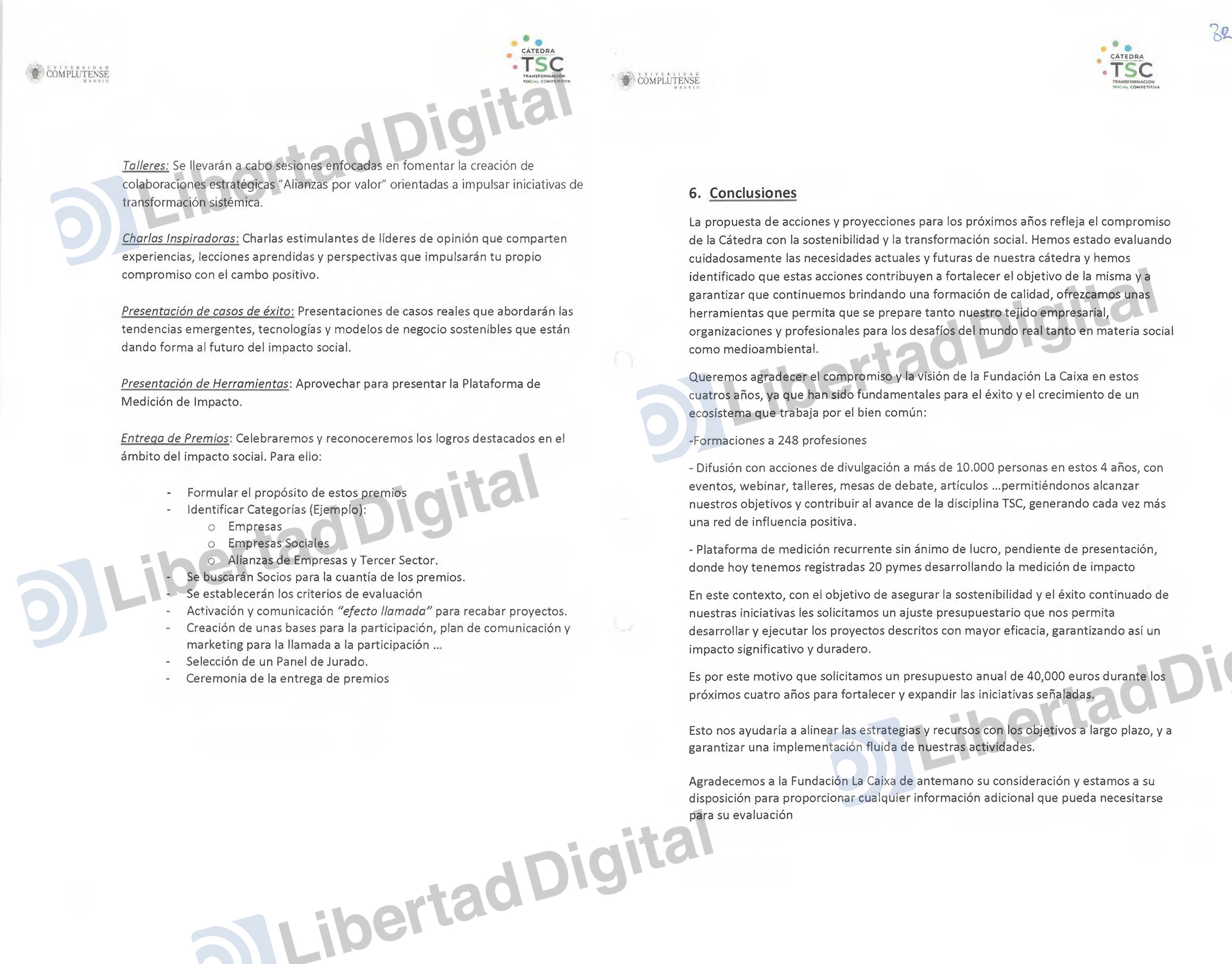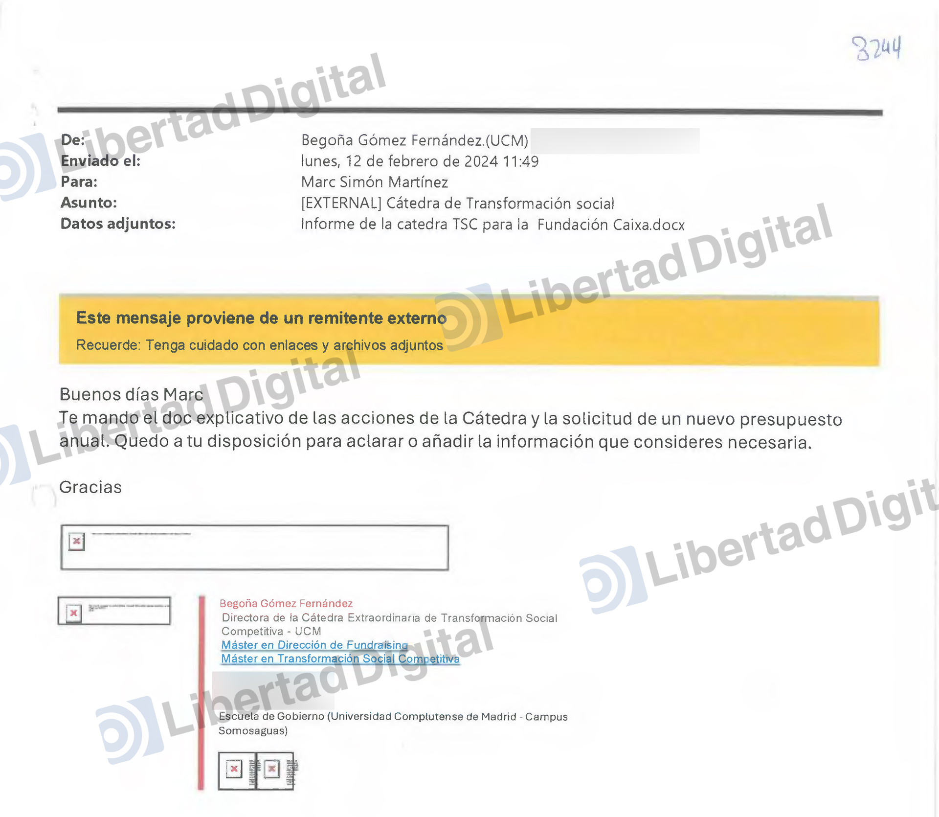 Libertad Digital publica en exclusiva el email remitido por la esposa del presidente del Gobierno Begoña Gómez en el que solicita a la Fundación La Caixa un presupuesto de 40.000 euros anuales durante los próximos 4 años para su cátedra de Transformación Social Competitiva (TSC) que codirigía en la Universidad Complutense de Madrid (UCM).