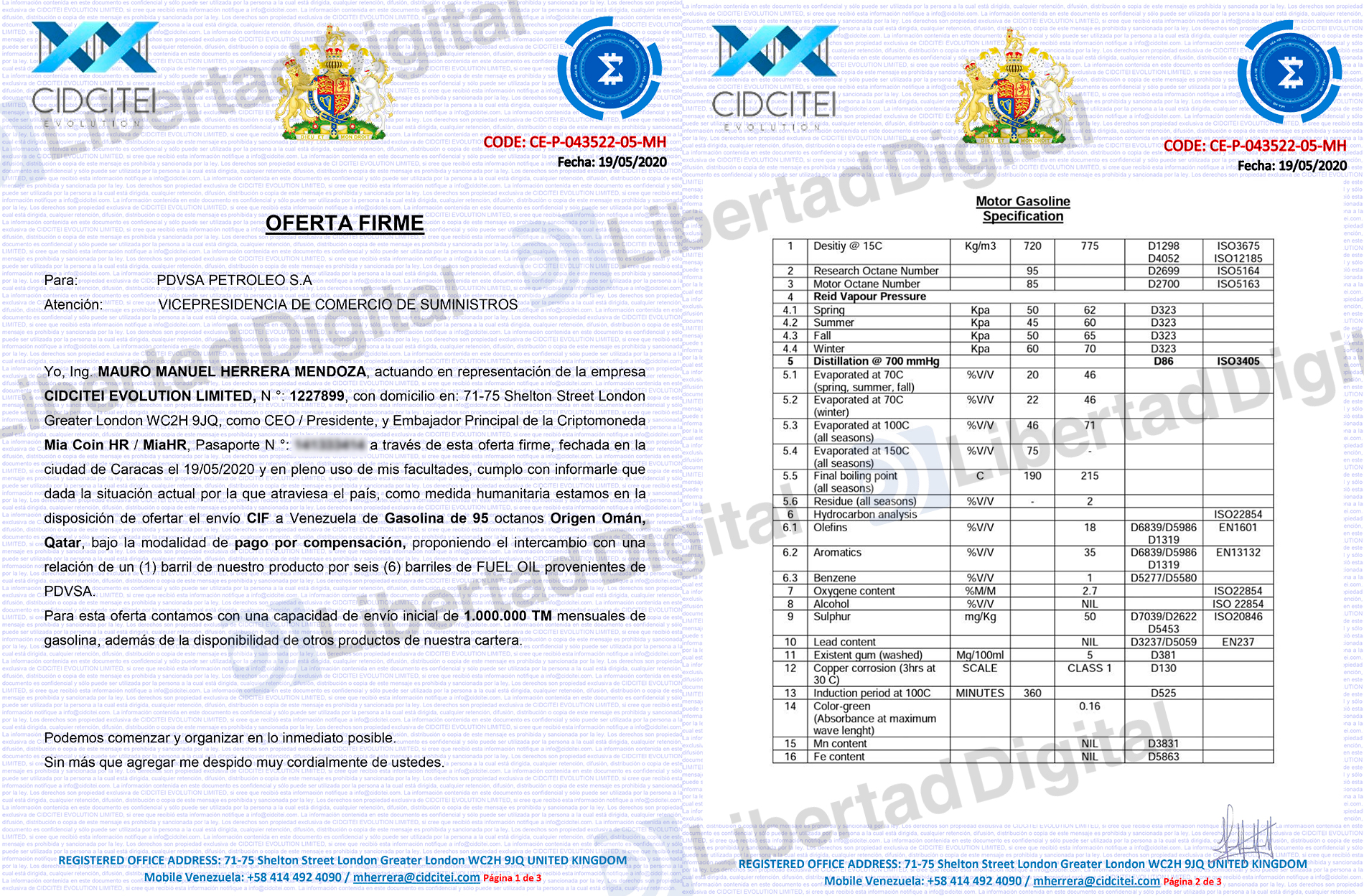 El documento denominado "oferta firme" está firmado por Mauro Manuel Herrera Mendoza como CEO de la empresa CIDCITEI Evolution Limited y como presidente y embajador principal de la Criptomoneda Mia Coin HR/MiaHR. El destinatario es la Vicepresidencia de Comercio de Suministros de PDVSA. Según su propia descripción, la compañía CIDCITEI Evolution Limited con sede en Londres (Inglaterra) es un "centro de negocios, dedicado a la compra venta de commodities (producto objeto de comercialización).