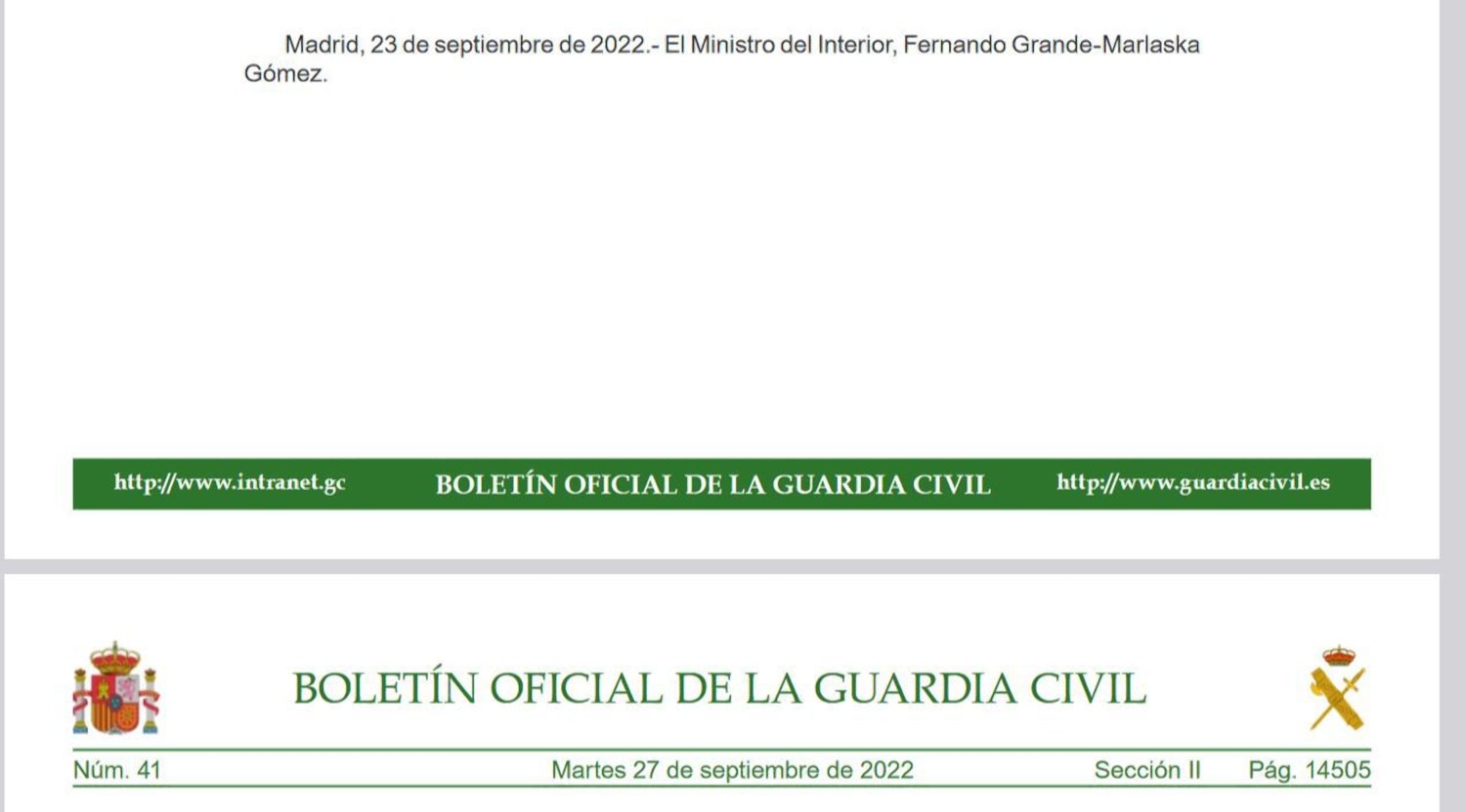Así quedó reflejado en el Boletín Oficial de la Guardia Civil (BOGC) del 27 de septiembre de ese año, al que ha tenido acceso Libertad Digital. La resolución que establece esa consideración al comisionista está firmada cuatro días antes –el 23 de septiembre de 2022– por el máximo responsable de la seguridad en nuestro país y ministro del Interior, Fernando Grande Marlaska.