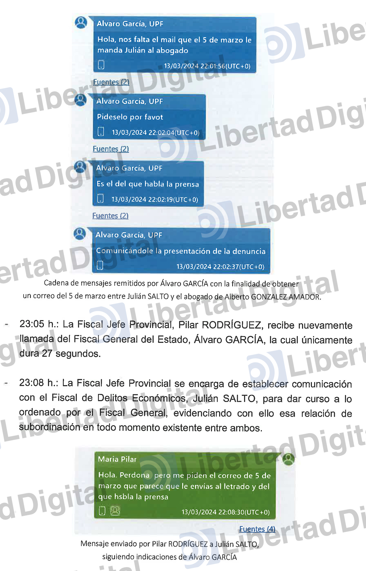 1. Las conversaciones mantenidas entre la Fiscal Jefe Provincial, Pilar Rodríguez, con la Fiscal de Sala Jefe de la Secretaría Técnica de la FGE, Ana Isabel García León, y con el Teniente Fiscal de la Secretaría Técnica de la FGE, Diego Villafañe, en las que se habla explícitamente de que la filtración es realizada por parte de la Fiscalía General del Estado.