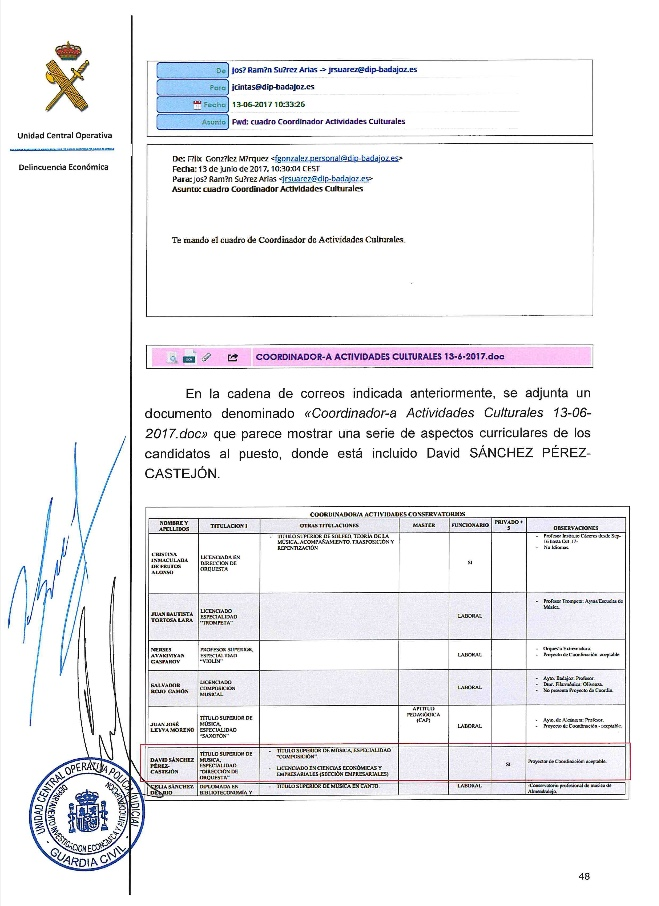 "En cuanto a la selección de los candidatos para el puesto de Coordinador de los Conservatorios provinciales, se encuentra el correo electrónico, de fecha 13 de junio de 2017, enviado por José Ramón SUAREZ ARIAS, a Juana CINTAS. Este correo electrónico y el documento que se adjunta en el mismo, proviene de un correo que, Félix GONZÁLEZ MÁRQUEZA envía, desde al dirección «fgonzalez.personal@dip-badajoz.es», a José Ramón SUAREZ ARIAS", aclara la UCO.