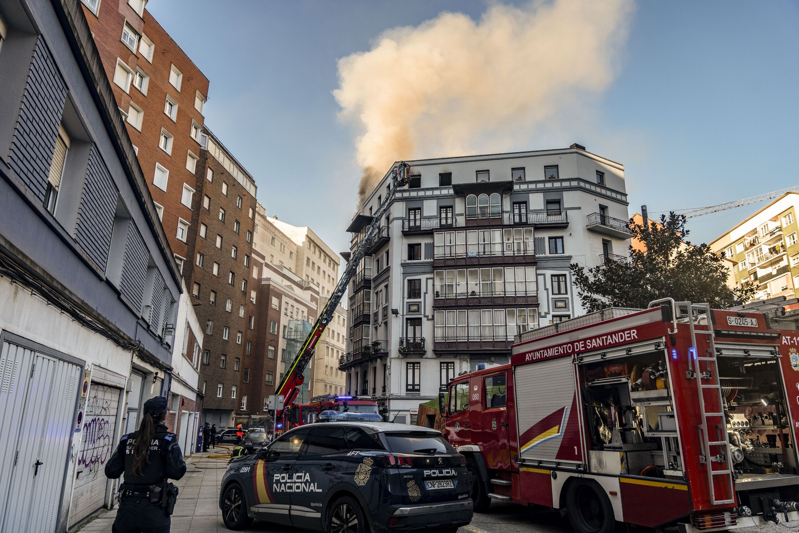 Los Bomberos de Santander han acudido a sofocar este incendio, que se ha iniciado en torno a las 9.00 horas en uno de los pisos superiores del inmueble, el quinto, que por encima tiene un ático que se ha visto afectado por el fuego.