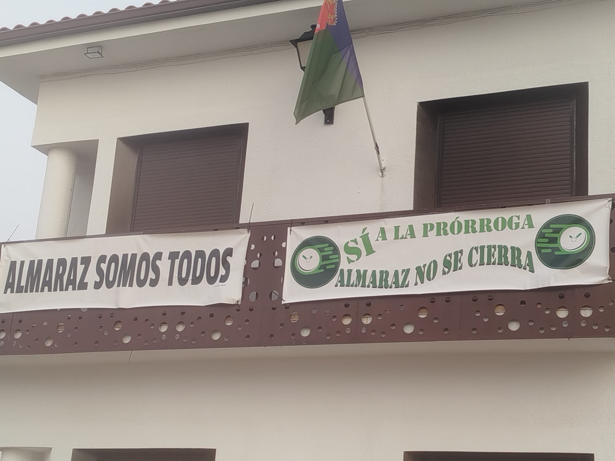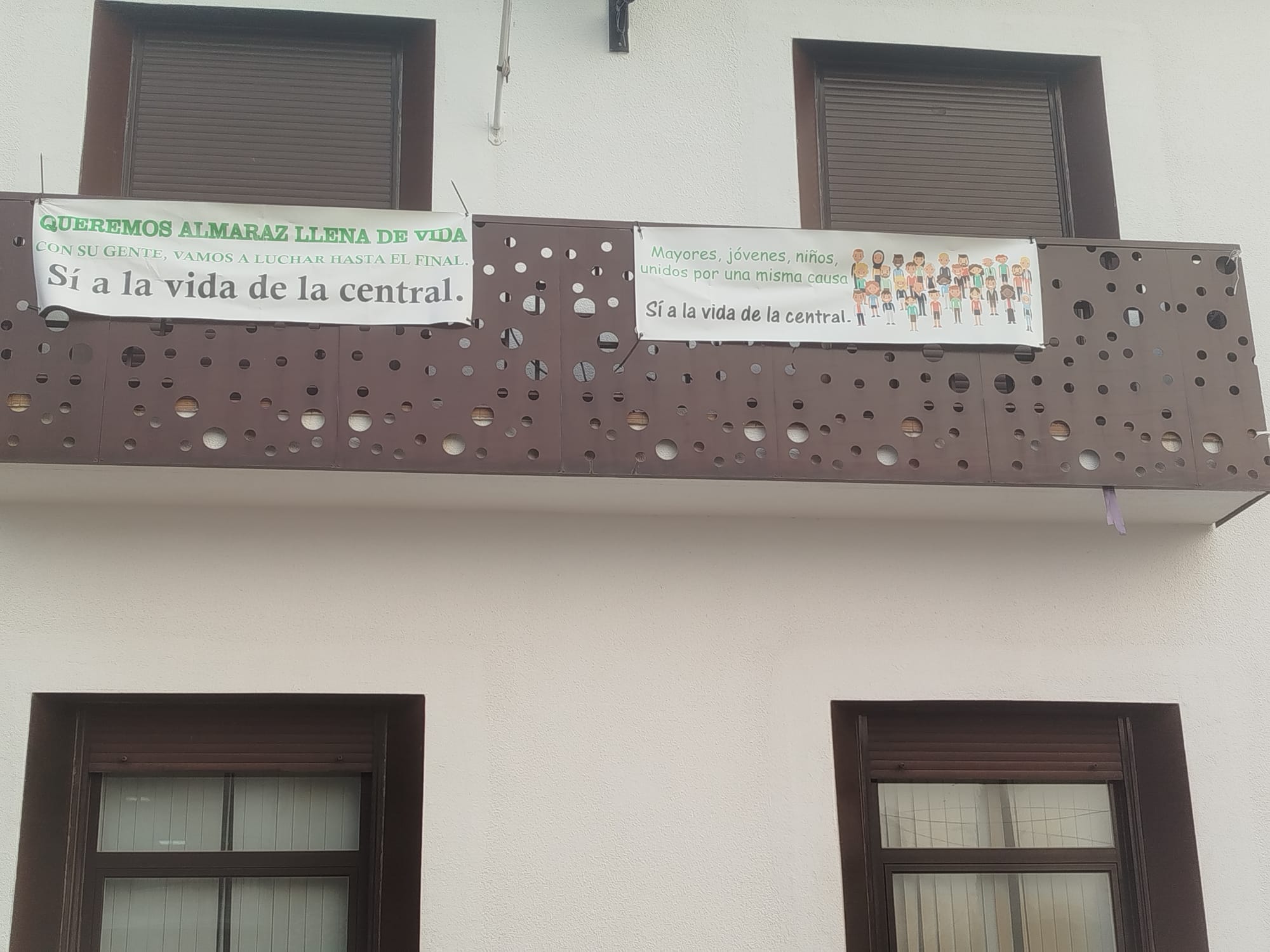 En la fachada del ayuntamiento de Almaraz, donde se concentraba la gente antes de la manifestación, destacan varias pancartas con mensajes como “ALMARAZ SOMOS TODOS" y “Sí a la prórroga. Almaraz no se cierra".