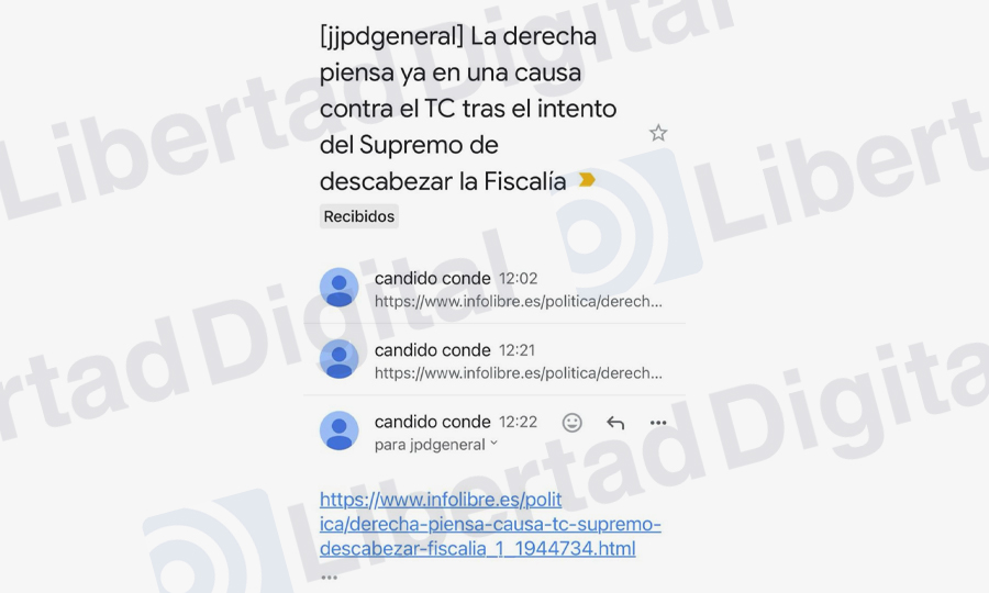 Libertad Digital publica el email que Cándido Conde-Pumpido envió a la asociación Juezas y Jueces para la Democracia que fundó en el que adjunta una noticia para forzar la elaboración de un comunicado contra la "derecha judicial" y en defensa del Tribunal Constitucional que preside.
