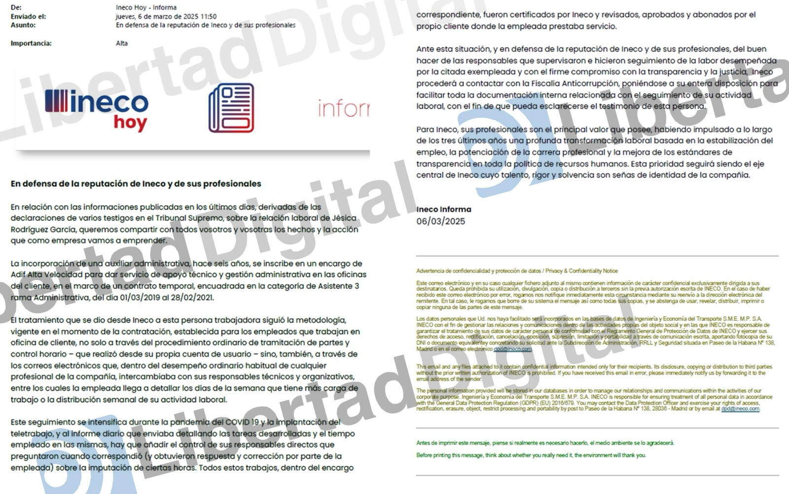 Un comunicado de Ineco remitido a los trabajadores el pasado 6 de marzo, al que ha tenido acceso Libertad Digital, asegura que la contratación de Jessica Rodríguez se efectuó a petición de ADIF: "La incorporación de una auxiliar administrativa, hace seis años, se inscribe en un encargo de Adif Alta Velocidad para dar servicio de apoyo técnico y gestión administrativa en las oficinas del cliente, en el marco de un contrato temporal, encuadrado en la categoría de Asistente 3 rama Administrativo, del día 01/03/2019 al 28/02/2021".