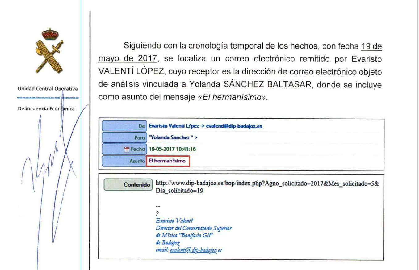 Un informe de la UCO de 77 páginas, al que ha tenido acceso Libertad Digital, recoge un correo electrónico que intercambiaron los responsables de los dos conservatorios de Badajoz clave para la investigación que dirige la titular del Juzgado de Instrucción nº 3 de Badajoz, Beatriz Biedma.