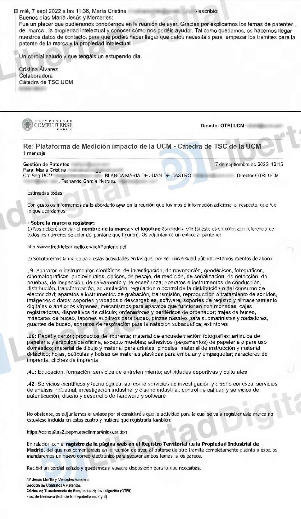 Libertad Digital publica un correo electrónico enviado por Cristina Álvarez el 7 de septiembre de 2022 a María Jesús Morillo y Mercedes Vaquero, miembros de la Oficina de Transparencia de Resultados de Investigación (OTRI) de la Complutense, en el que les agradece su información para registrar la marca de la esposa del presidente del Gobierno Pedro Sánchez de la Cátedra de Transformación Social Competitiva (TSC) que codirigía: