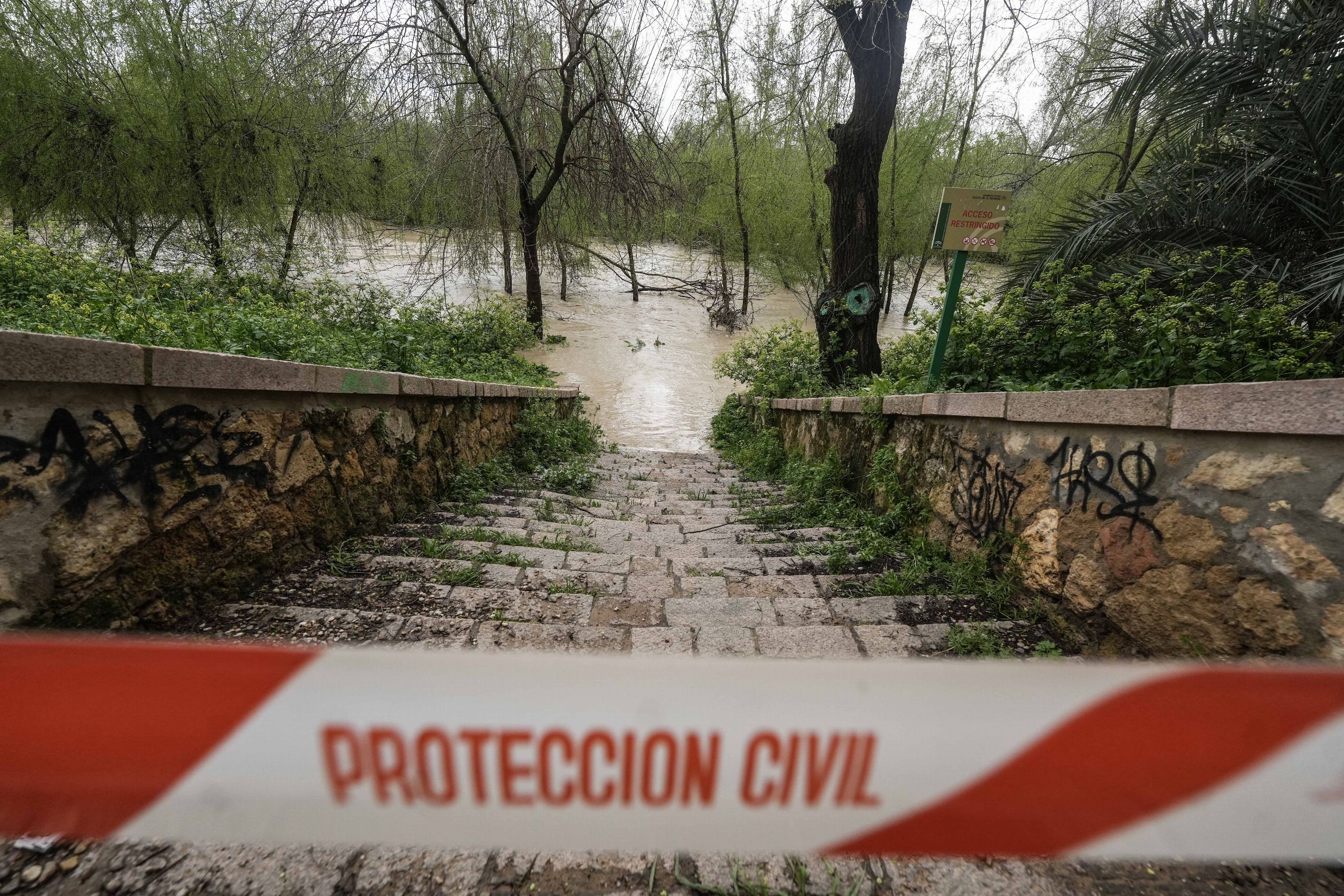 Cerrada al paso una de las escaleras de los Sotos de la Albolafia debido a la crecida del río Guadalquivir a su paso por el casco urbano de Córdoba tras los últimos días de lluvias que ha provocado, de nuevo este lunes, que se active el nivel naranja o de vigilancia al superar los dos metros de lámina de agua a las 14.30 horas en la estación de Casillas, según la medición del Sistema Automático de Información Hidrológica (SAIH) de la Confederación Hidrográfica del Guadalquivir (CHG).EFE / Rafa Alcaide