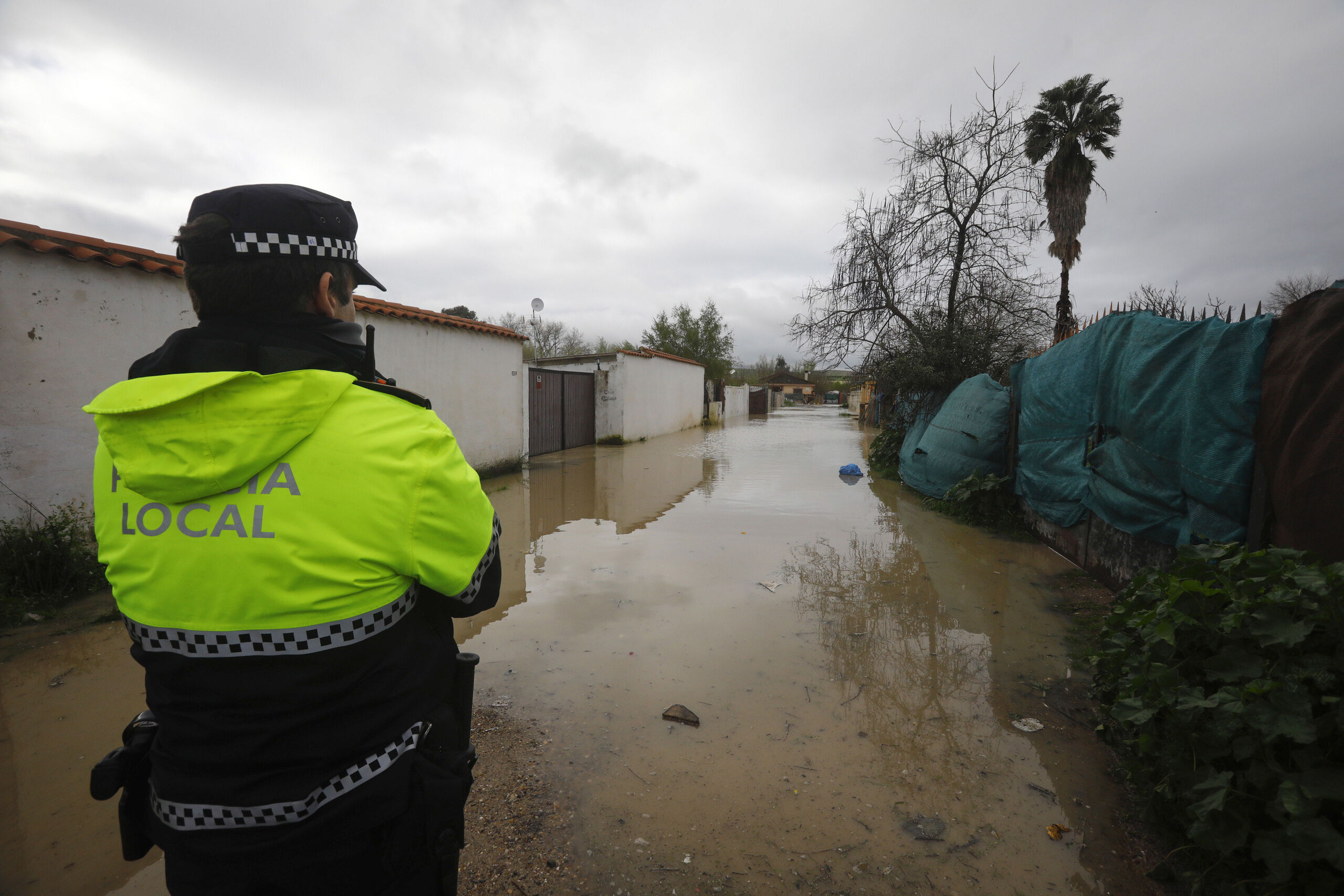 Un miembro de la policía local supervisa el desalojo de viviendas ubicadas en el entorno del aeropuerto de Córdoba en las parcelaciones con riesgo de inundación al subir el nivel de riesgo del río Guadalquivir en Córdoba, este martes. Las abundantes y persistentes lluvias han dejado acumulados de hasta 55 litros en el suroeste de la península esta madrugada. EFE/Salas