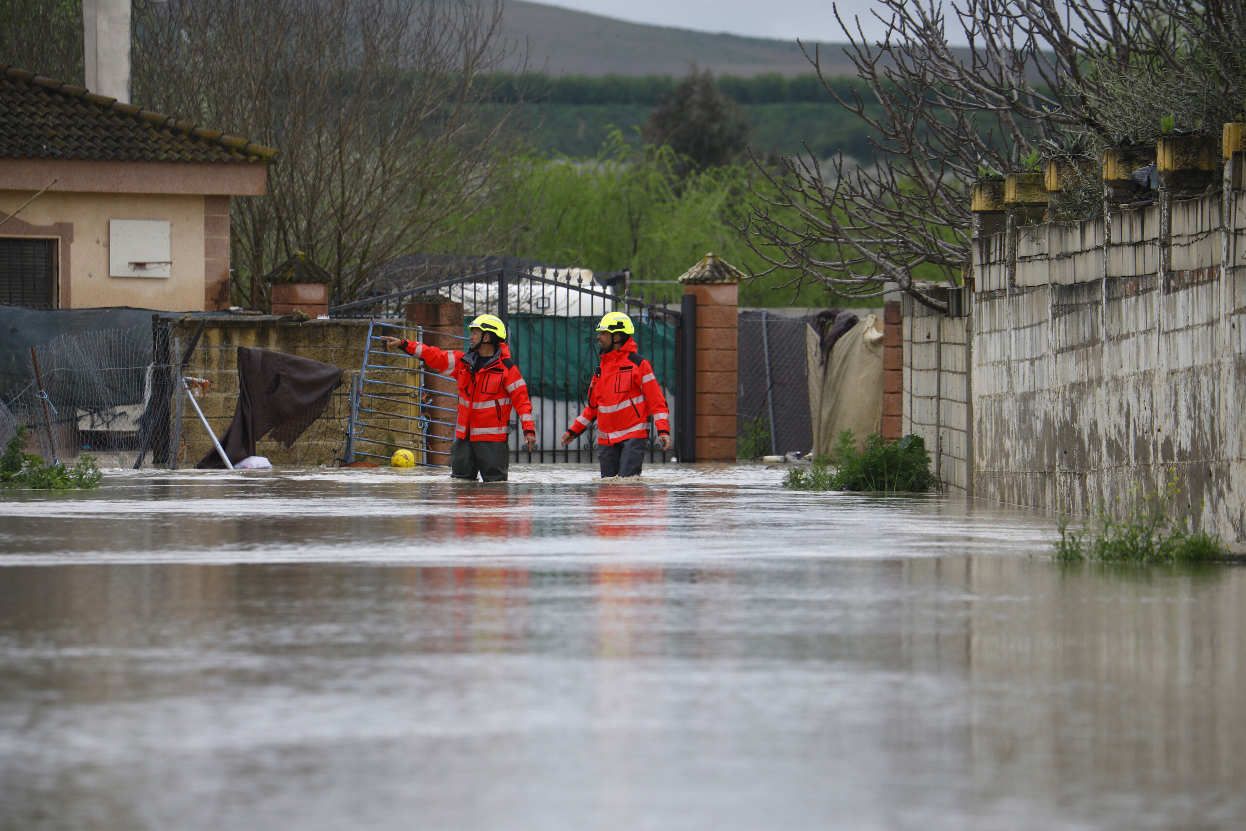 Bomberos y policía local asisten a vecinos en el desalojo de sus viviendas en el entorno del aeropuerto de Córdoba, en las parcelaciones con riesgo de inundación al subir el nivel de riesgo del río Guadalquivir en Córdoba, este martes. Las abundantes y persistentes lluvias han dejado acumulados de hasta 55 litros en el suroeste de la península esta madrugada. EFE/Salas