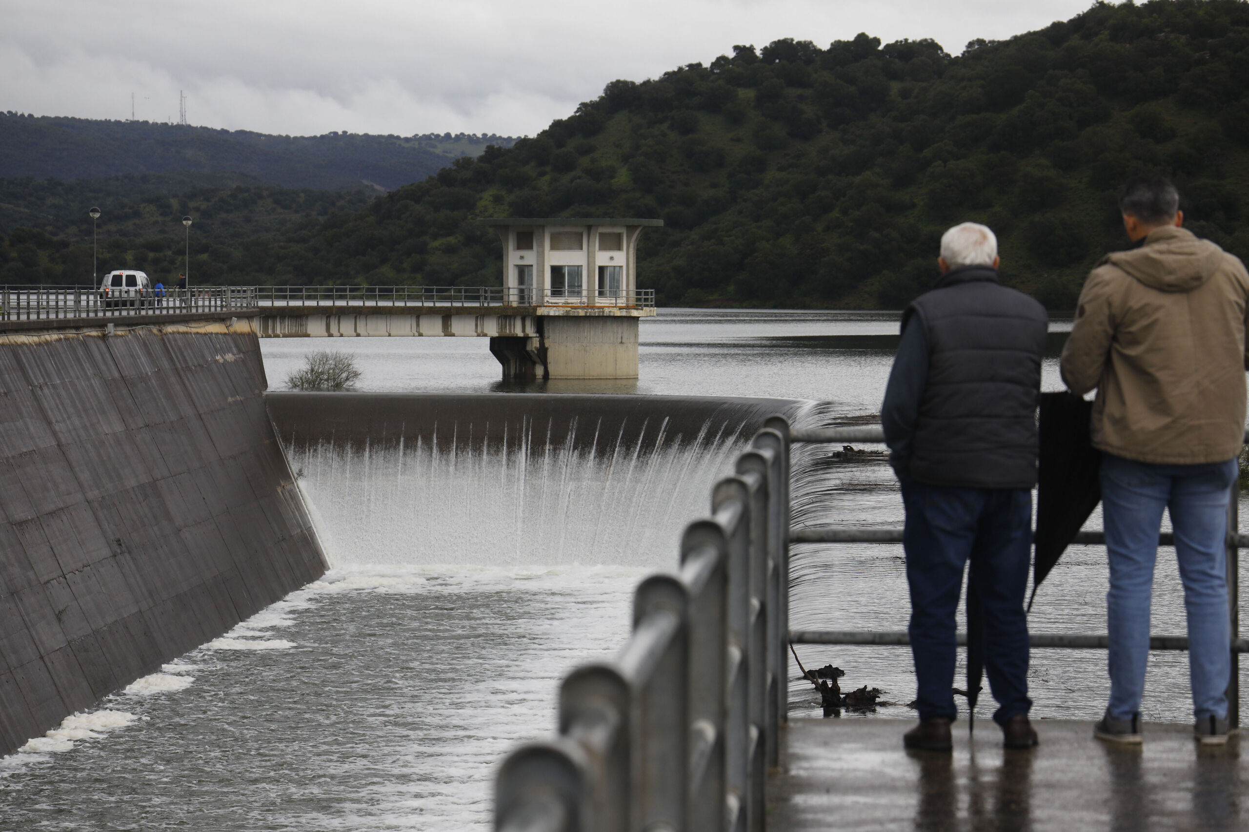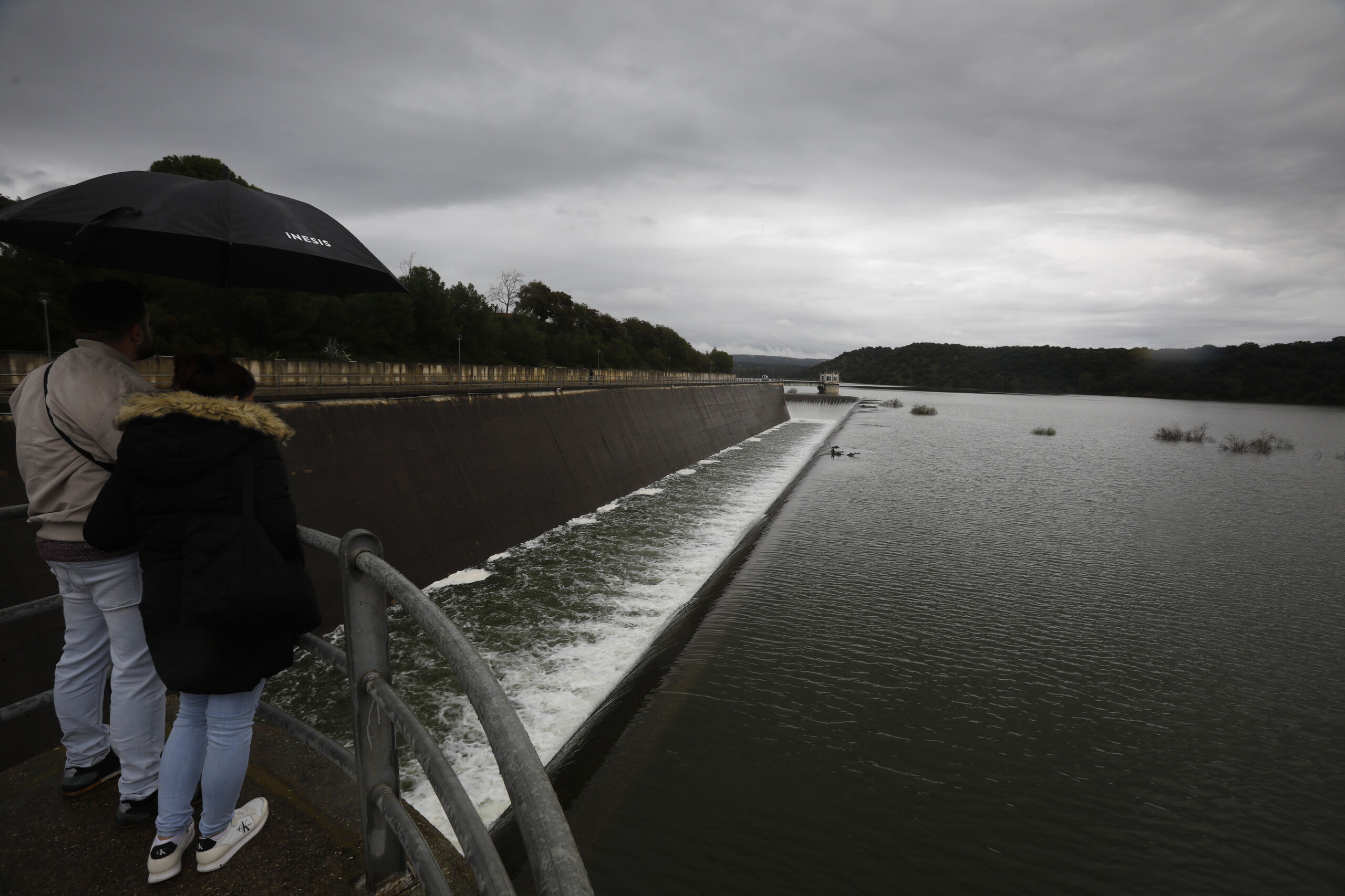 Unas personas observan el embalse de San Rafael de Navallana en Córdoba que vierte sus aguas al río Guadalmellato, afluente del Guadalquivir, y que sigue aliviando agua este lunes desde que se encuentra al 100,58 por ciento, un 2,6 por ciento más que ayer domingo, según los datos de la Confederación Hidrográfica del Guadalquivir consultados por EFE. EFE/Salas