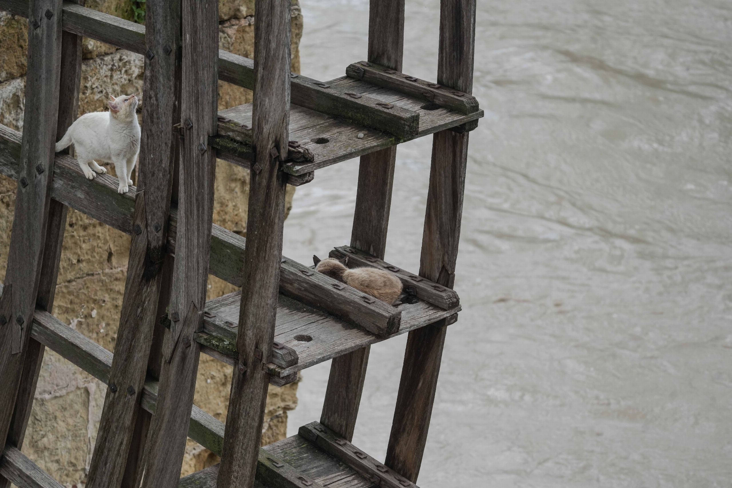 Varios gatos subidos a los peldaños del Molino de Martos junto al Puente Romano de Córdoba tras la crecida del río Guadalquivir, cuyo umbral a su paso por el casco urbano ha entrado de nuevo este lunes en nivel naranja o de vigilancia al superar los dos metros de lámina de agua a las 14.30 horas en la estación de Casillas, según la medición del Sistema Automático de Información Hidrológica (SAIH) de la Confederación Hidrográfica del Guadalquivir (CHG).EFE / Rafa Alcaide