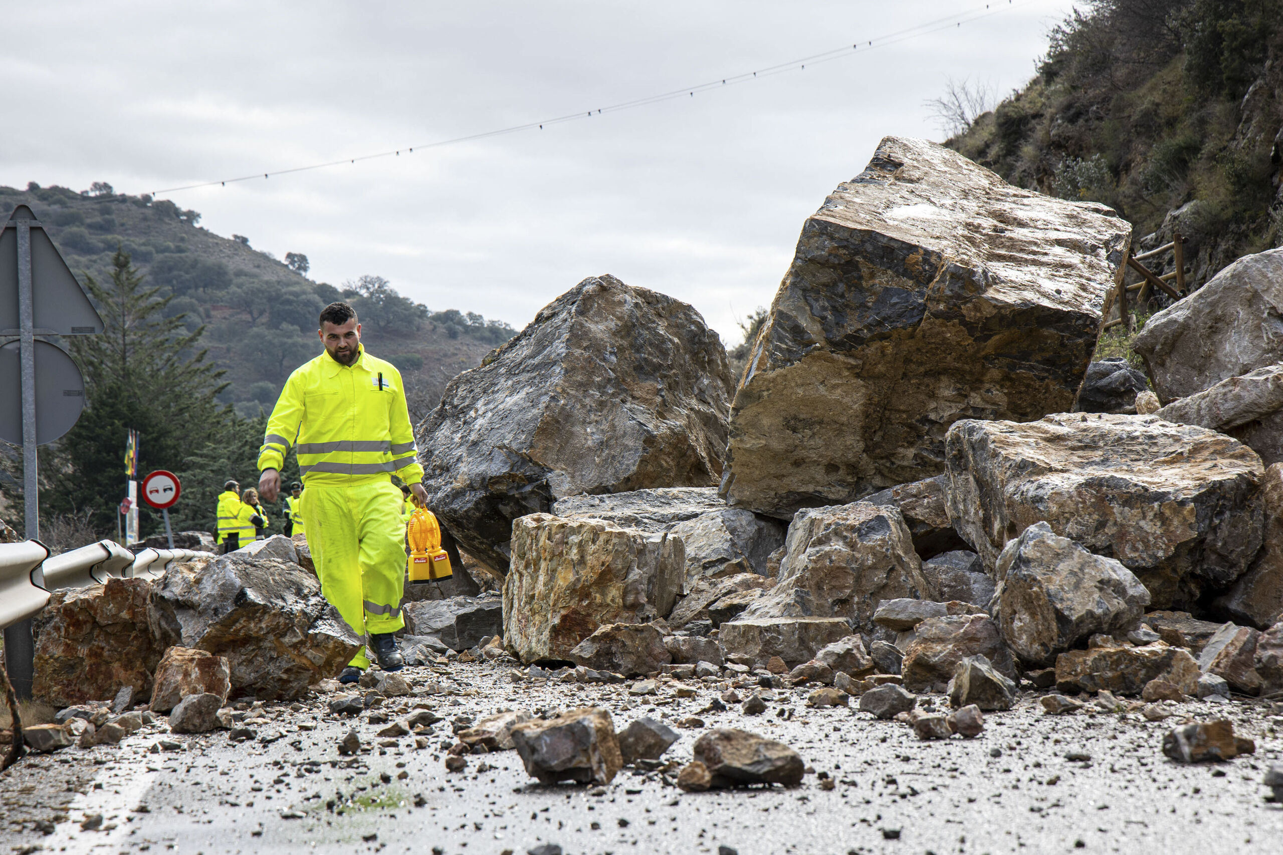 Un equipo de técnicos, apoyados por drones, supervisa la zona alta de la ladera desde la que se desprendieron grandes rocas este martes, bloqueando la calzada de la LR-115, en el kilómetro 13,7, y dejando incomunicado el municipio de Arnedillo en la zona del valle del Cidacos.