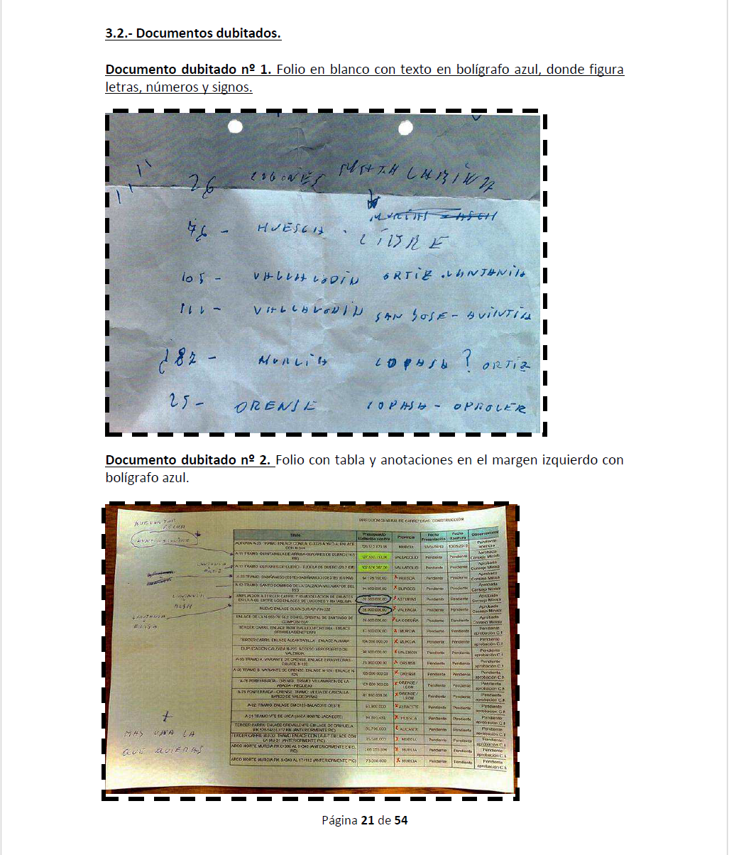 El dictamen pericial caligráfico de 54 páginas, al que ha tenido acceso Libertad Digital, afirma que "del estudio grafonómico, estudio de los gestos tipo, se extrae la conclusión de que existe una misma autoría en documentos indubitados y documentos dubitados nº 1 y 2, existiendo la misma identidad gráfica. Hemos visto como existen multitud de grafías que presentan la misma ejecución, los mismos movimientos de la mano, los mismos arpones en los puntos de inicio o finales, la misma forma, la misma inclinación, las mismas torsiones, etc, gestos, la mayoría de ellos, de vital importancia por ser gestos que escapan al consciente de la persona y son de difícil imitación o automodificación por realizarse de forma innata y autómata".