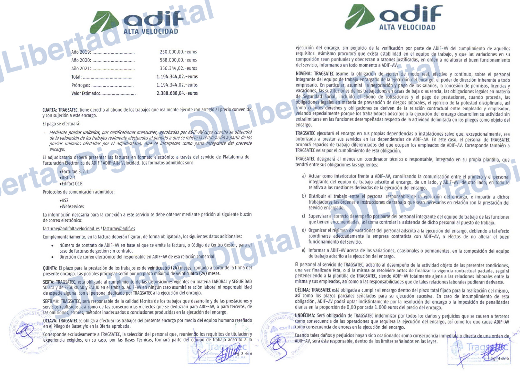 El contrato de 6 páginas suscrito por ADIF y Tragsatec con Jéssica Rodríguez el 16 de mayo de 2019, al que ha tenido acceso Libertad Digital, señala que "la propuesta de los trabajos fue aprobada por la Presidenta de ADIF Alta Velocidad, con fecha 8 de mayo de 2019, previo el Informe de Análisis de Documentación Presentada, elaborado sobre la oferta presentada por TRAGSATEC, con un presupuesto de un millón ciento noventa y cuatro mil trescientos cuarenta y cuatro euros con dos céntimos {1.194.344,02 €), IVA no incluido, y un plazo de ejecución de los trabajos de veinticuatro {24) meses".