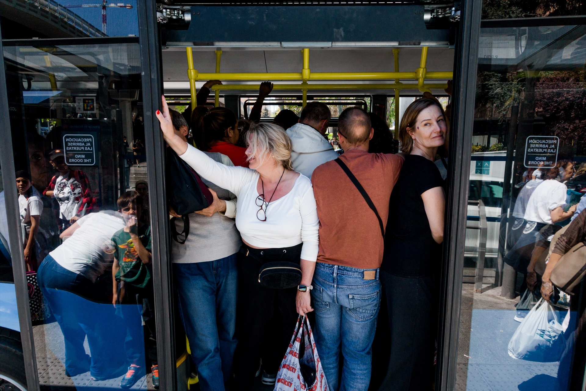 Autobús lleno ante la avalancha de usuarios que recurrieron a este medio de transporte para desplazarse durante el apagón, en Madrid.