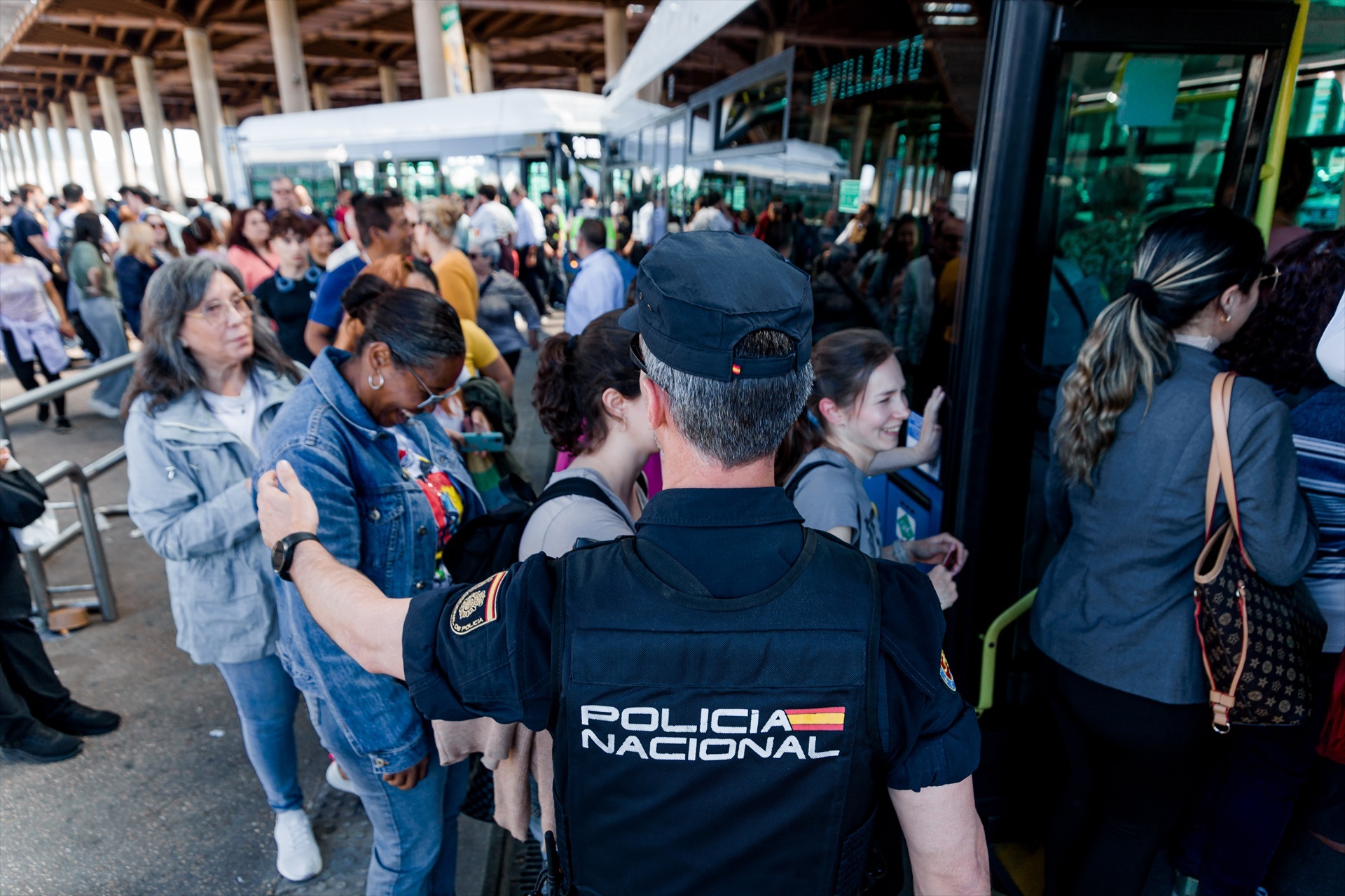 Agente de la Policía Nacional garantizando la seguridad y el orden durante la reubicación de pasajeros de tren en autobuses.