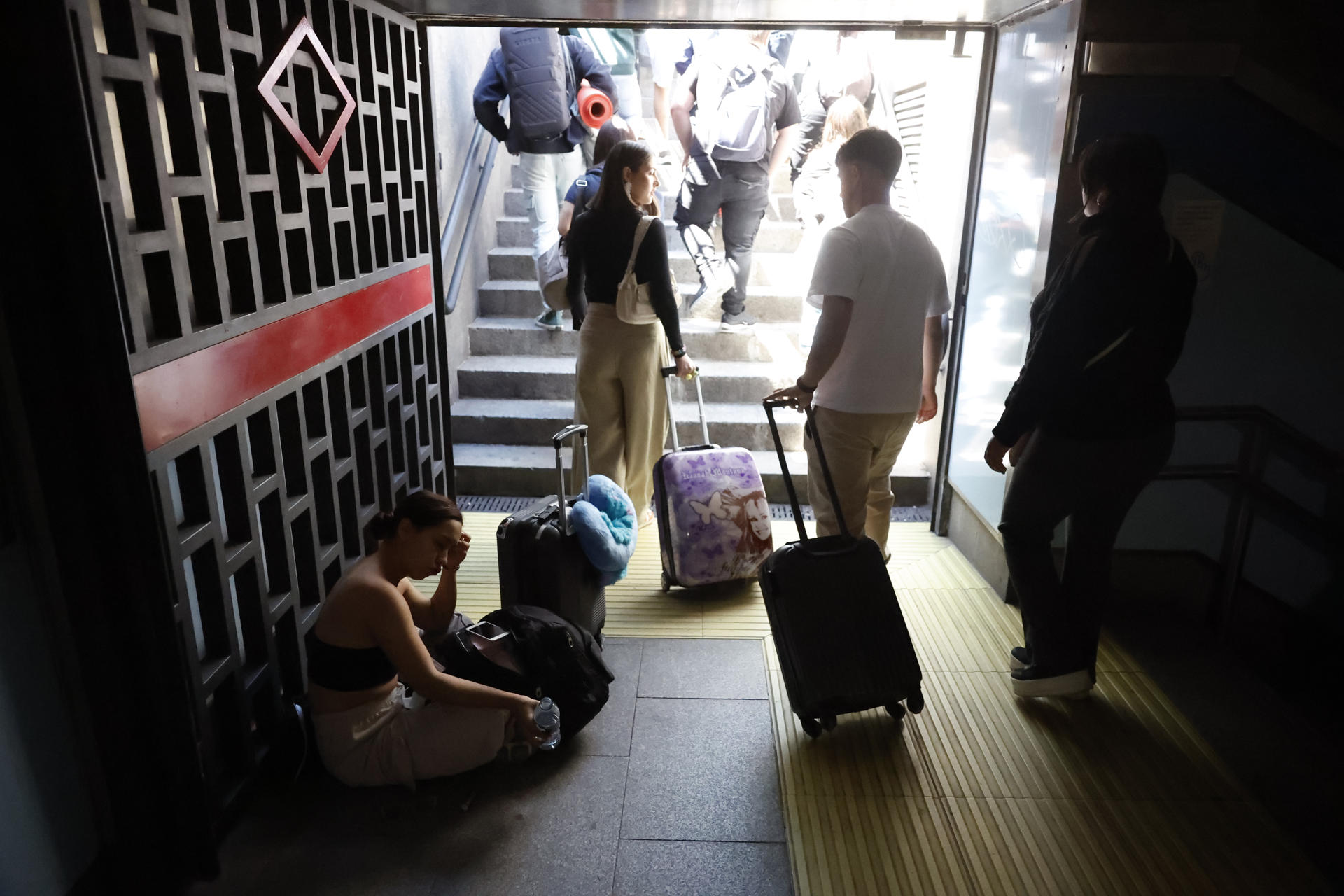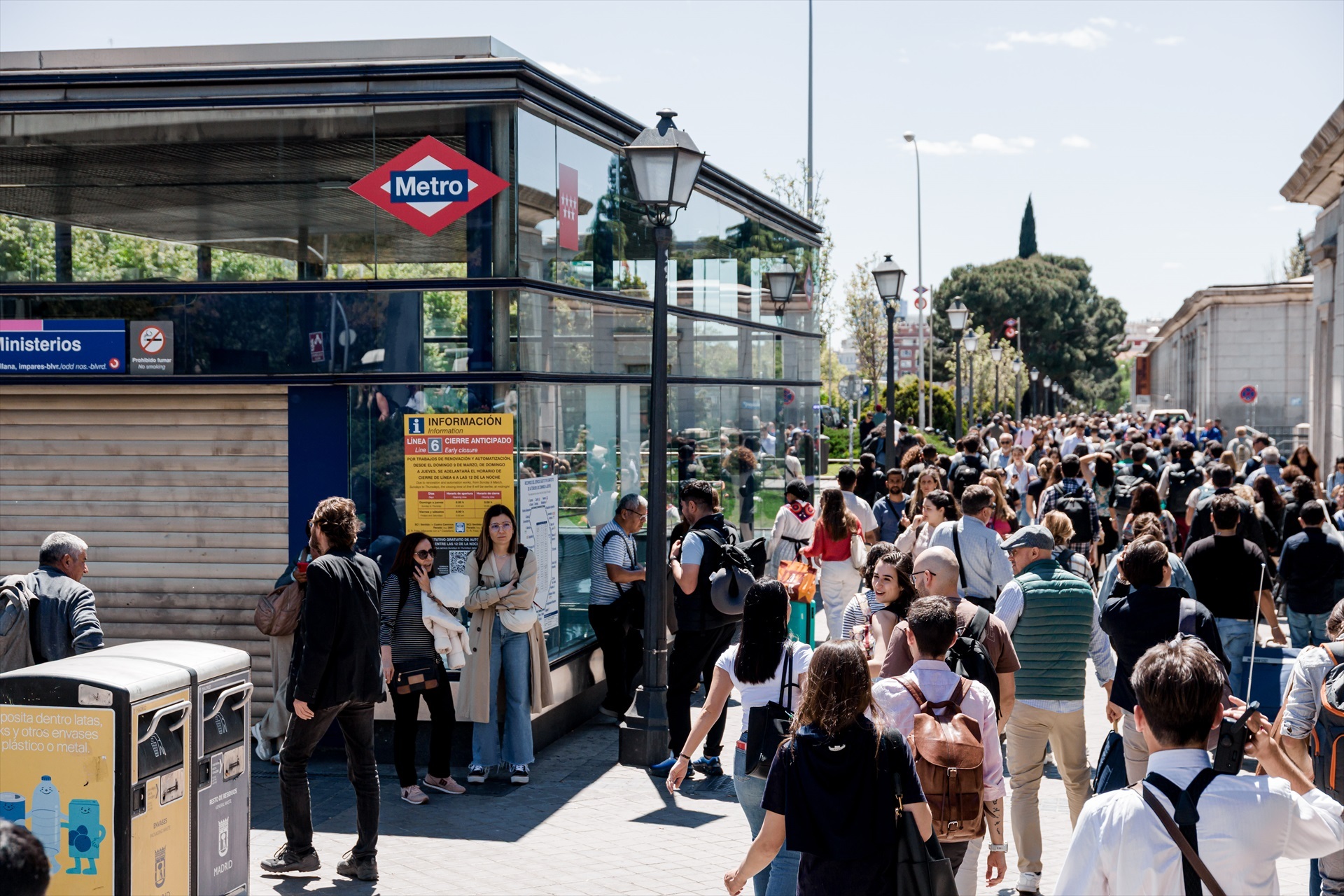 Usuarios de Metro de Madrid abandonan la estación de Tribunal tras el apagón.