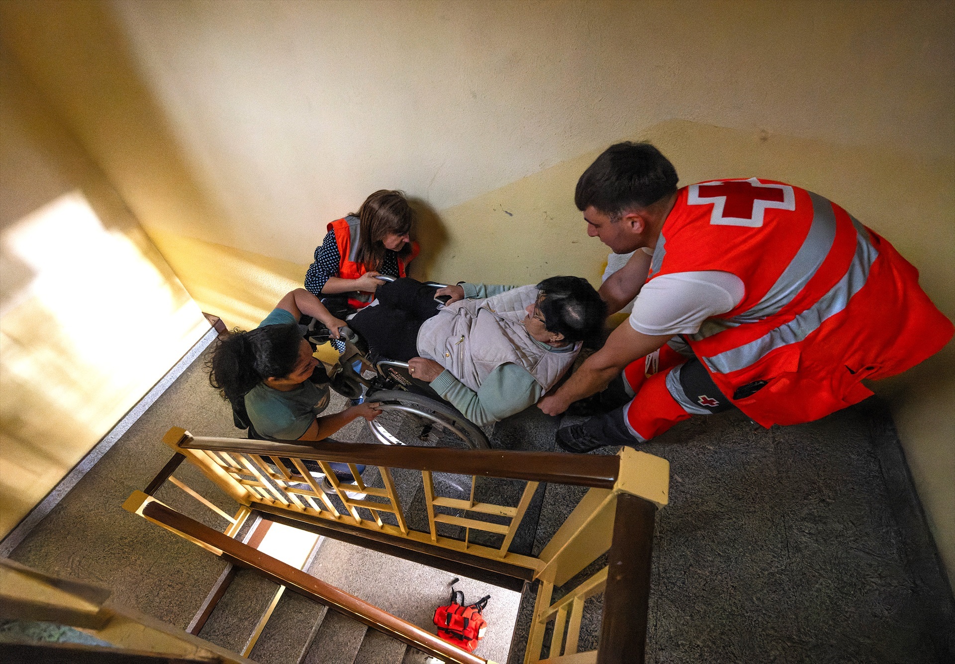 Efectivos de Emergencias ayudan a una persona con movilidad reducida en Burgos.