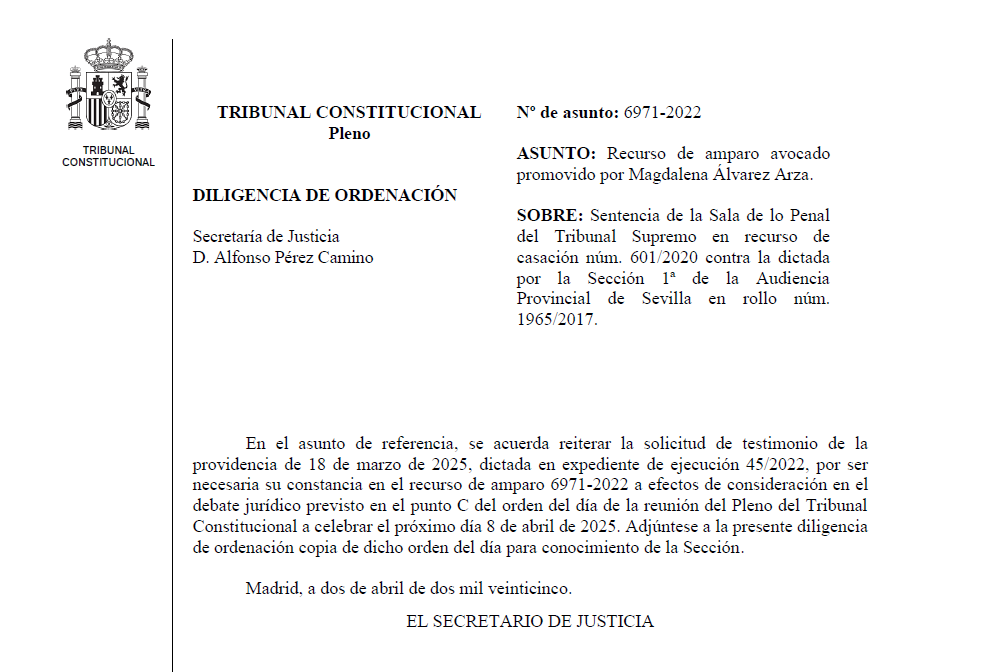 Libertad Digital ha tenido acceso a la diligencia que remitió como contestación el tribunal de Conde-Pumpido a los magistrados sevillanos una semana antes de la celebración del Pleno del TC del pasado 8 de abril: "En el asunto de referencia, se acuerda reiterar la solicitud de testimonio de la providencia de 18 de marzo de 2025, dictada en expediente de ejecución 45/2022, por ser necesaria su constancia en el recurso de amparo 6971-2022 a efectos de consideración en el debate jurídico previsto en el punto C del orden del día de la reunión del Pleno del Tribunal Constitucional a celebrar el próximo día 8 de abril de 2025. Adjúntese a la presente diligencia de ordenación copia de dicho orden del día para conocimiento de la Sección".