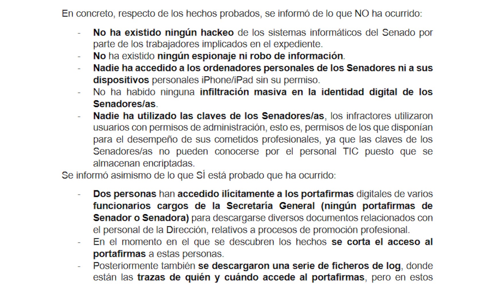 El citado informe, al que ha tenido acceso Libertad Digital, confirma que "no ha existido ningún hackeo de los sistemas informáticos del Senado por parte de los trabajadores implicados en el expediente", "no ha existido ningún espionaje ni robo de información", y que "nadie ha accedido a los ordenadores personales de los Senadores ni a sus dispositivos personales iPhone/iPad sin su permiso".