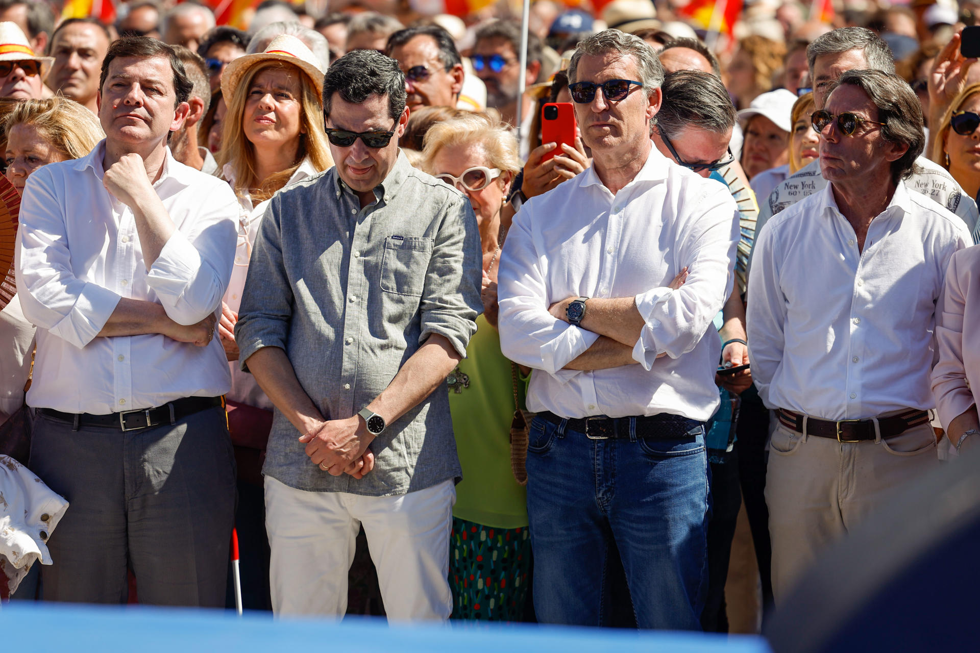El líder del PP, Alberto Núñez Feijóo, ha estado arropado por otros líderes como el presidente de la Junta de Andalucía, Juanma Moreno, y el presidente de la Junta de Castilla y León, Alfonso Fernández Mañueco. En la imagen también podemos ver al expresidente del Gobierno de España, José María Aznar.