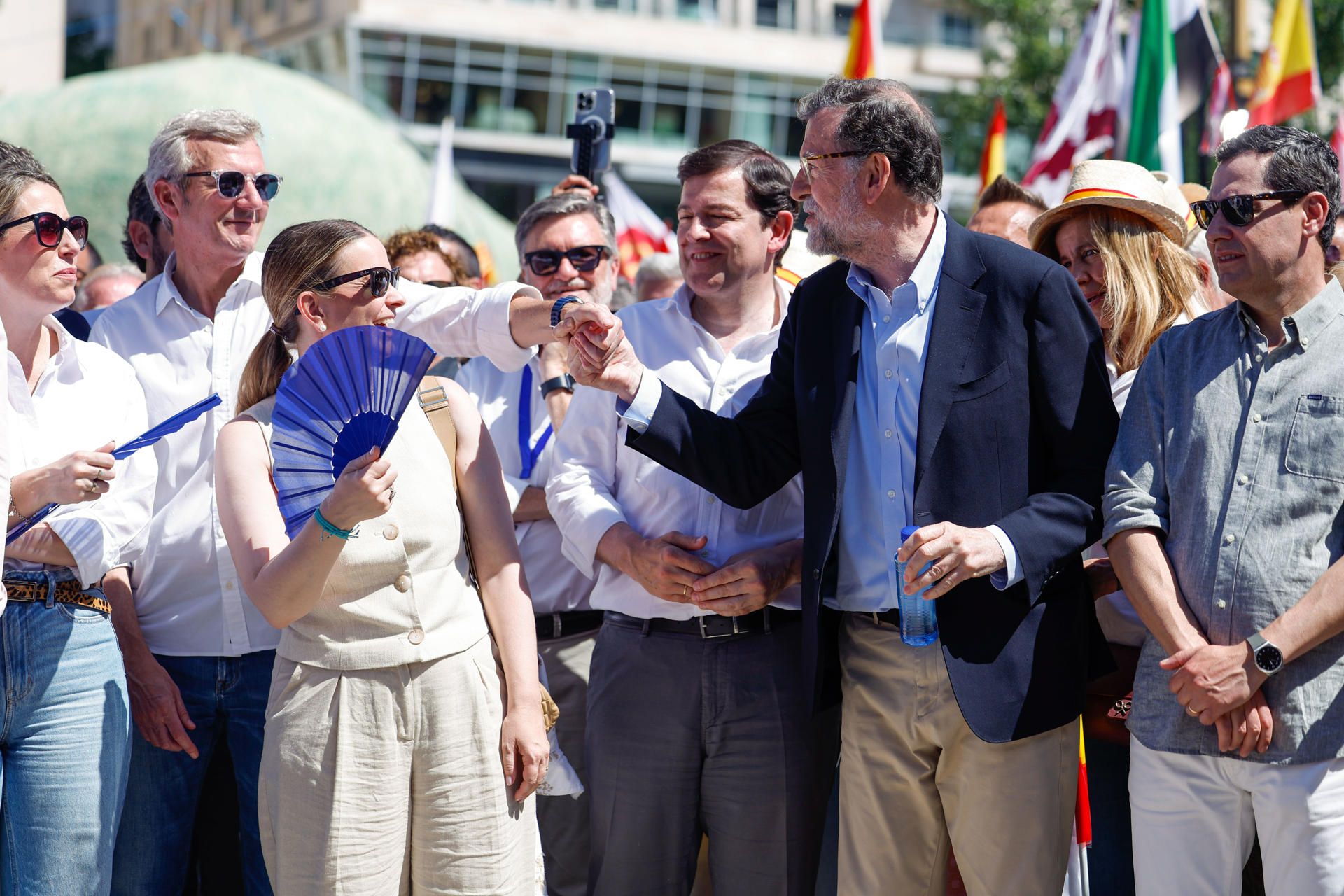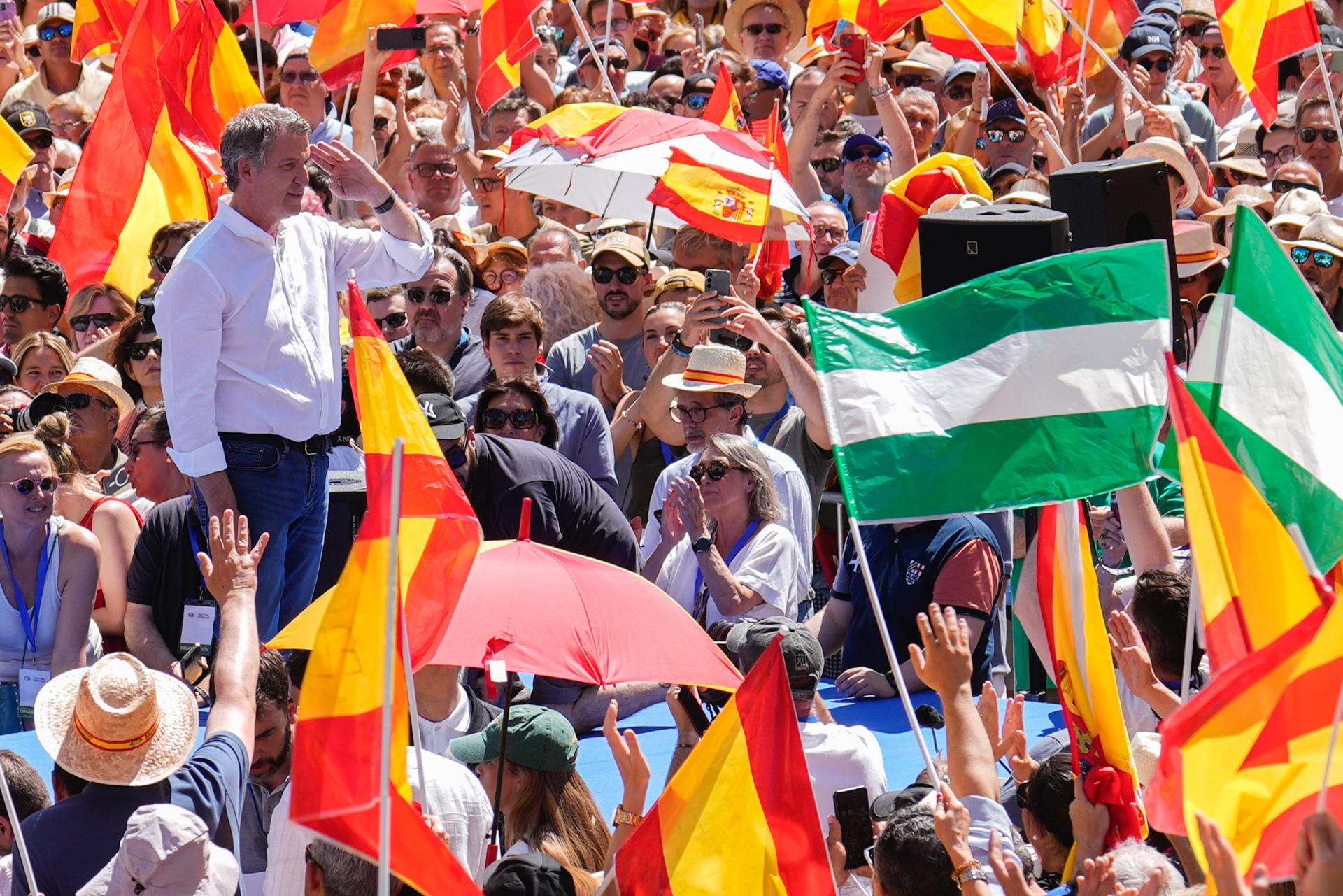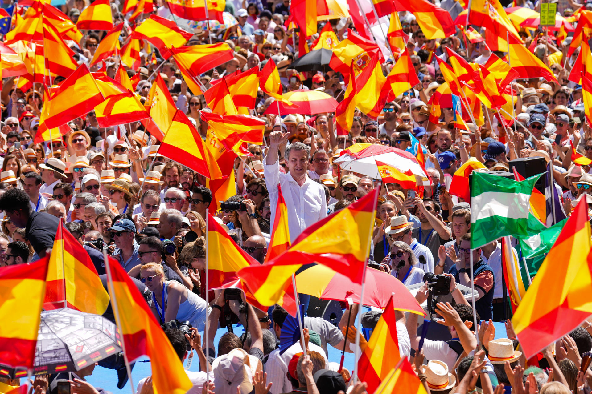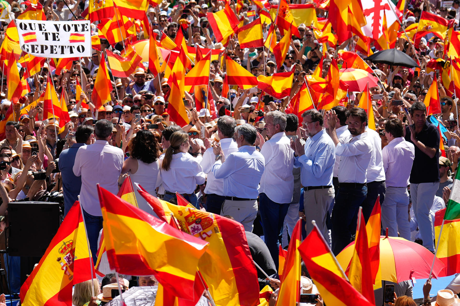 El presidente del PP, Alberto Núñez Feijóo, ha sido aclamado en diferentes momentos de la concentración. En varias ocasiones se han escuchado gritos de “presidente” entre la multitud durante su intervención.